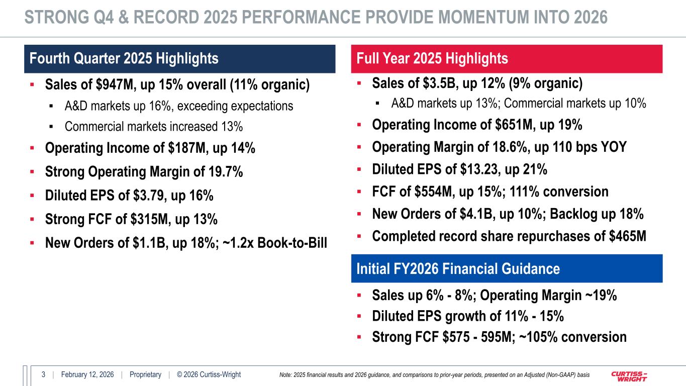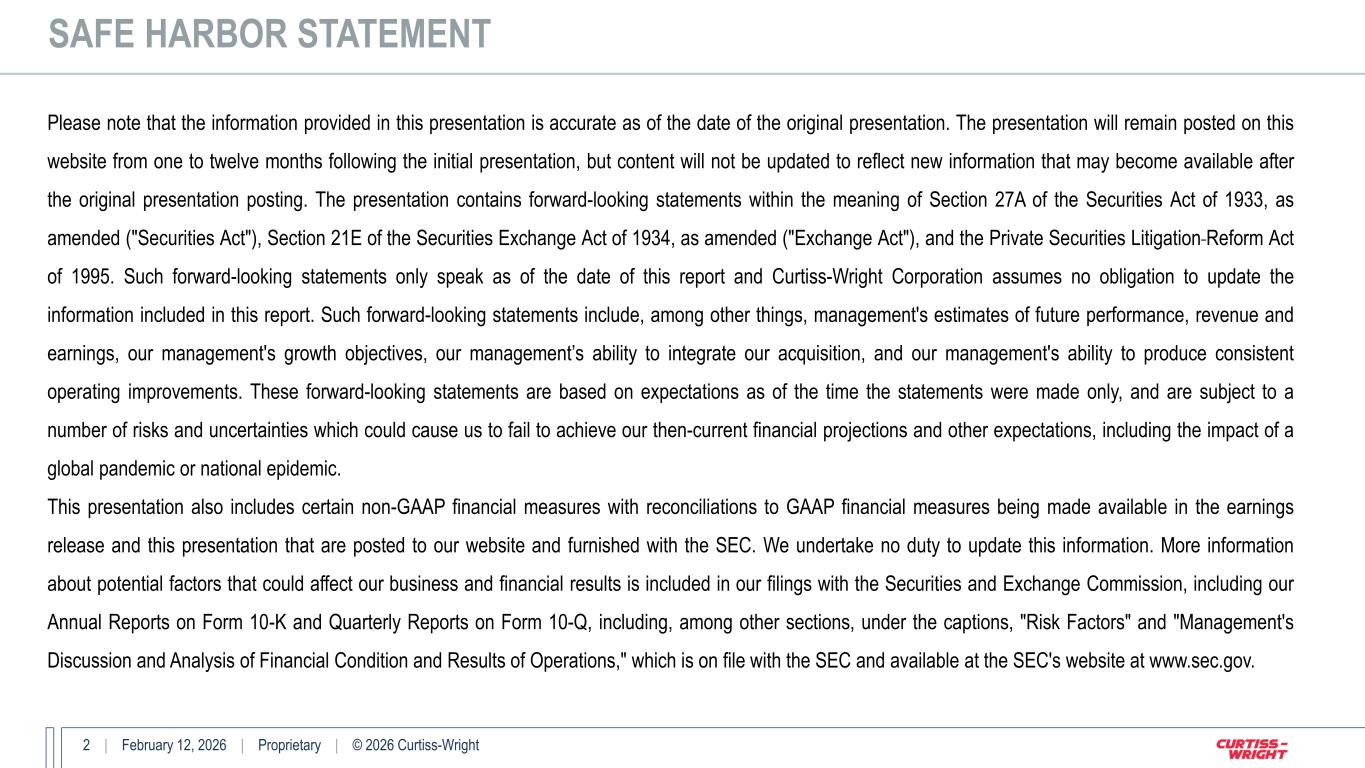 2 | February 12, 2026 | Proprietary | © 2026 Curtiss-Wright Please note that the information provided in this presentation is accurate as of the date of the original presentation. The presentation will remain posted on this website from one to twelve months following the initial presentation, but content will not be updated to reflect new information that may become available after the original presentation posting. The presentation contains forward-looking statements within the meaning of Section 27A of the Securities Act of 1933, as amended ("Securities Act"), Section 21E of the Securities Exchange Act of 1934, as amended ("Exchange Act"), and the Private Securities Litigation Reform Act of 1995. Such forward-looking statements only speak as of the date of this report and Curtiss-Wright Corporation assumes no obligation to update the information included in this report. Such forward-looking statements include, among other things, management's estimates of future performance, revenue and earnings, our management's growth objectives, our management’s ability to integrate our acquisition, and our management's ability to produce consistent operating improvements. These forward-looking statements are based on expectations as of the time the statements were made only, and are subject to a number of risks and uncertainties which could cause us to fail to achieve our then-current financial projections and other expectations, including the impact of a global pandemic or national epidemic. This presentation also includes certain non-GAAP financial measures with reconciliations to GAAP financial measures being made available in the earnings release and this presentation that are posted to our website and furnished with the SEC. We undertake no duty to update this information. More information about potential factors that could affect our business and financial results is included in our filings with the Securities and Exchange Commission, including our Annual Reports on Form 10-K and Quarterly Reports on Form 10-Q, including, among other sections, under the captions, "Risk Factors" and "Management's Discussion and Analysis of Financial Condition and Results of Operations," which is on file with the SEC and available at the SEC's website at www.sec.gov. SAFE HARBOR STATEMENT