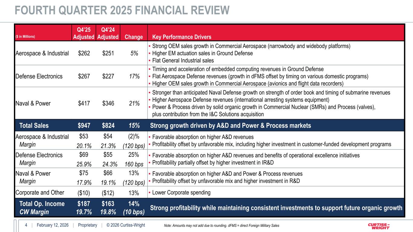 3 | February 12, 2026 | Proprietary | © 2026 Curtiss-Wright Fourth Quarter 2025 Highlights STRONG Q4 & RECORD 2025 PERFORMANCE PROVIDE MOMENTUM INTO 2026 ▪ Sales of $947M, up 15% overall (11% organic) ▪ A&D markets up 16%, exceeding expectations ▪ Commercial markets increased 13% ▪ Operating Income of $187M, up 14% ▪ Strong Operating Margin of 19.7% ▪ Diluted EPS of $3.79, up 16% ▪ Strong FCF of $315M, up 13% ▪ New Orders of $1.1B, up 18%; ~1.2x Book-to-Bill Full Year 2025 Highlights Initial FY2026 Financial Guidance ▪ Sales of $3.5B, up 12% (9% organic) ▪ A&D markets up 13%; Commercial markets up 10% ▪ Operating Income of $651M, up 19% ▪ Operating Margin of 18.6%, up 110 bps YOY ▪ Diluted EPS of $13.23, up 21% ▪ FCF of $554M, up 15%; 111% conversion ▪ New Orders of $4.1B, up 10%; Backlog up 18% ▪ Completed record share repurchases of $465M ▪ Sales up 6% - 8%; Operating Margin ~19% ▪ Diluted EPS growth of 11% - 15% ▪ Strong FCF $575 - 595M; ~105% conversion Note: 2025 financial results and 2026 guidance, and comparisons to prior-year periods, presented on an Adjusted (Non-GAAP) basis