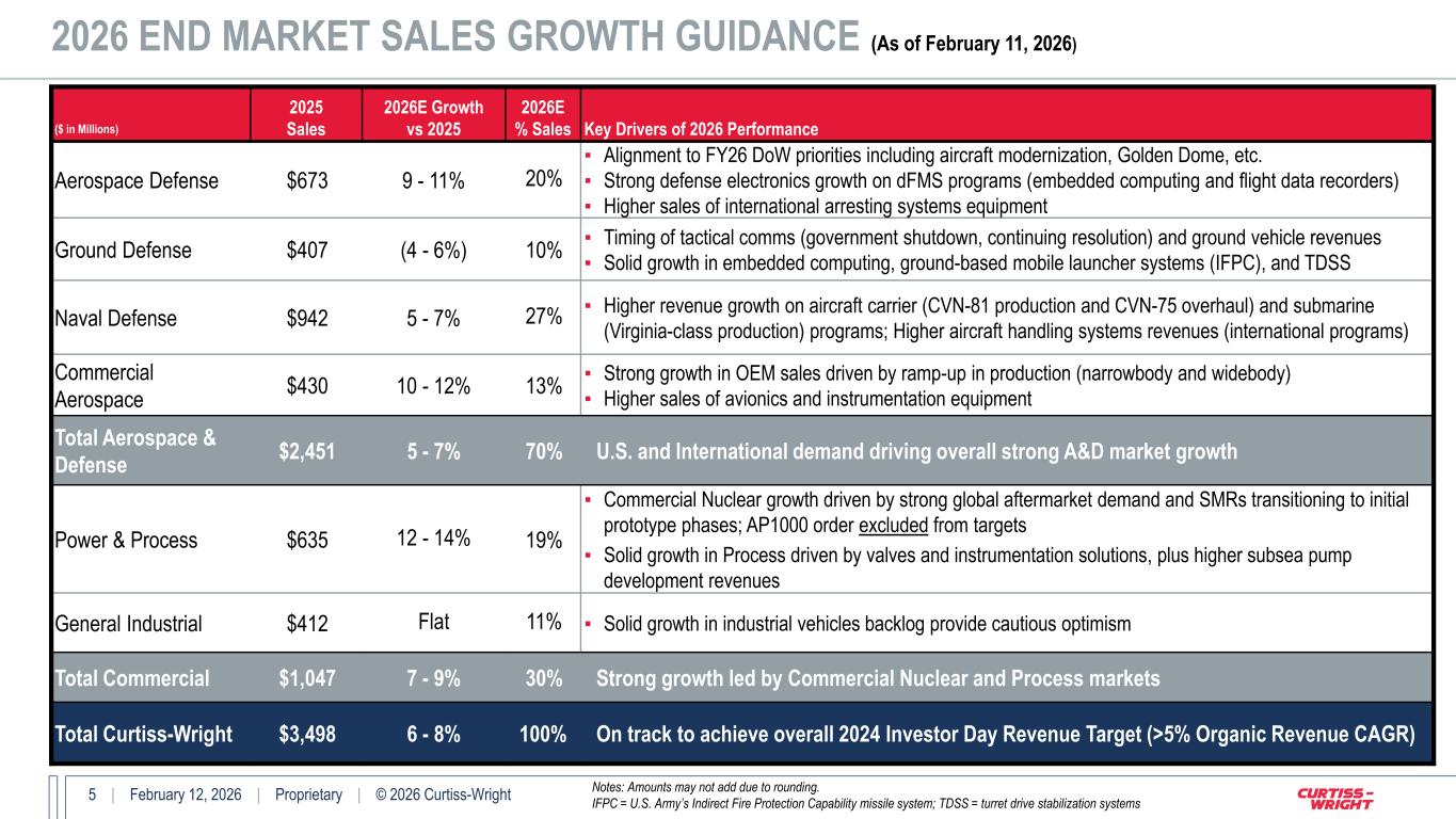 4 | February 12, 2026 | Proprietary | © 2026 Curtiss-Wright ($ in Millions) Q4’25 Adjusted Q4’24 Adjusted Change Key Performance Drivers Aerospace & Industrial $262 $251 5% ▪ Strong OEM sales growth in Commercial Aerospace (narrowbody and widebody platforms) ▪ Higher EM actuation sales in Ground Defense ▪ Flat General Industrial sales Defense Electronics $267 $227 17% ▪ Timing and acceleration of embedded computing revenues in Ground Defense ▪ Flat Aerospace Defense revenues (growth in dFMS offset by timing on various domestic programs) ▪ Higher OEM sales growth in Commercial Aerospace (avionics and flight data recorders) Naval & Power $417 $346 21% ▪ Stronger than anticipated Naval Defense growth on strength of order book and timing of submarine revenues ▪ Higher Aerospace Defense revenues (international arresting systems equipment) ▪ Power & Process driven by solid organic growth in Commercial Nuclear (SMRs) and Process (valves), plus contribution from the I&C Solutions acquisition Total Sales $947 $824 15% Strong growth driven by A&D and Power & Process markets Aerospace & Industrial Margin $53 20.1% $54 21.3% (2)% (120 bps) ▪ Favorable absorption on higher A&D revenues ▪ Profitability offset by unfavorable mix, including higher investment in customer-funded development programs Defense Electronics Margin $69 25.9% $55 24.3% 25% 160 bps ▪ Favorable absorption on higher A&D revenues and benefits of operational excellence initiatives ▪ Profitability partially offset by higher investment in IR&D Naval & Power Margin $75 17.9% $66 19.1% 13% (120 bps) ▪ Favorable absorption on higher A&D and Power & Process revenues ▪ Profitability offset by unfavorable mix and higher investment in R&D Corporate and Other ($10) ($12) 13% ▪ Lower Corporate spending Total Op. Income CW Margin $187 19.7% $163 19.8% 14% (10 bps) Strong profitability while maintaining consistent investments to support future organic growth FOURTH QUARTER 2025 FINANCIAL REVIEW Note: Amounts may not add due to rounding. dFMS = direct Foreign Military Sales