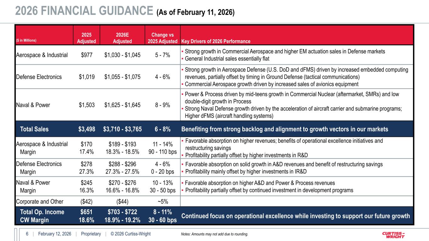 5 | February 12, 2026 | Proprietary | © 2026 Curtiss-Wright 2026 END MARKET SALES GROWTH GUIDANCE (As of February 11, 2026) Notes: Amounts may not add due to rounding. IFPC = U.S. Army’s Indirect Fire Protection Capability missile system; TDSS = turret drive stabilization systems ($ in Millions) 2025 Sales 2026E Growth vs 2025 2026E % Sales Key Drivers of 2026 Performance Aerospace Defense $673 9 - 11% 20% ▪ Alignment to FY26 DoW priorities including aircraft modernization, Golden Dome, etc. ▪ Strong defense electronics growth on dFMS programs (embedded computing and flight data recorders) ▪ Higher sales of international arresting systems equipment Ground Defense $407 (4 - 6%) 10% ▪ Timing of tactical comms (government shutdown, continuing resolution) and ground vehicle revenues ▪ Solid growth in embedded computing, ground-based mobile launcher systems (IFPC), and TDSS Naval Defense $942 5 - 7% 27% ▪ Higher revenue growth on aircraft carrier (CVN-81 production and CVN-75 overhaul) and submarine (Virginia-class production) programs; Higher aircraft handling systems revenues (international programs) Commercial Aerospace $430 10 - 12% 13% ▪ Strong growth in OEM sales driven by ramp-up in production (narrowbody and widebody) ▪ Higher sales of avionics and instrumentation equipment Total Aerospace & Defense $2,451 5 - 7% 70% U.S. and International demand driving overall strong A&D market growth Power & Process $635 12 - 14% 19% ▪ Commercial Nuclear growth driven by strong global aftermarket demand and SMRs transitioning to initial prototype phases; AP1000 order excluded from targets ▪ Solid growth in Process driven by valves and instrumentation solutions, plus higher subsea pump development revenues General Industrial $412 Flat 11% ▪ Solid growth in industrial vehicles backlog provide cautious optimism Total Commercial $1,047 7 - 9% 30% Strong growth led by Commercial Nuclear and Process markets Total Curtiss-Wright $3,498 6 - 8% 100% On track to achieve overall 2024 Investor Day Revenue Target (>5% Organic Revenue CAGR)