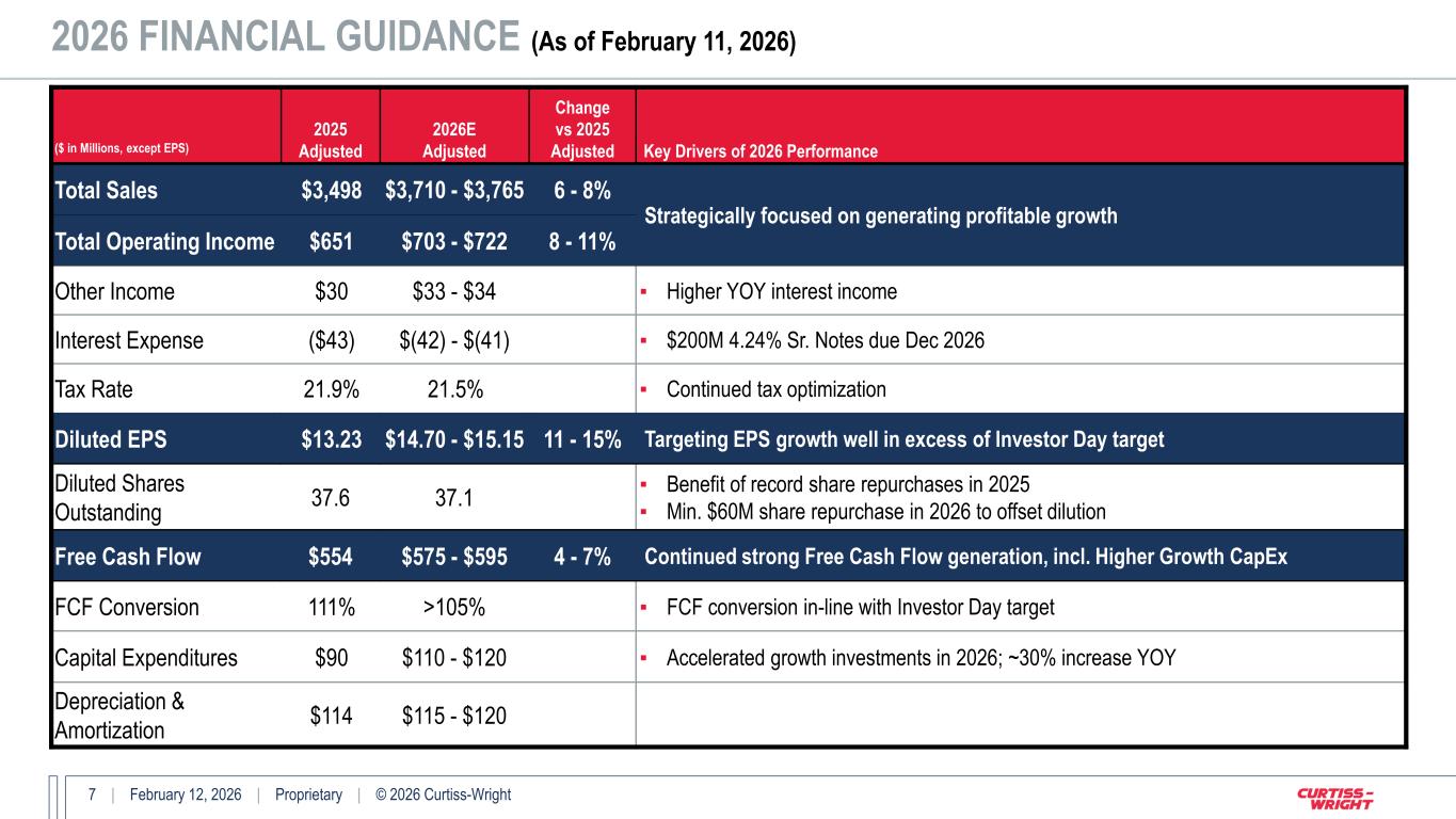 6 | February 12, 2026 | Proprietary | © 2026 Curtiss-Wright 2026 FINANCIAL GUIDANCE (As of February 11, 2026) ($ in Millions) 2025 Adjusted 2026E Adjusted Change vs 2025 Adjusted Key Drivers of 2026 Performance Aerospace & Industrial $977 $1,030 - $1,045 5 - 7% ▪ Strong growth in Commercial Aerospace and higher EM actuation sales in Defense markets ▪ General Industrial sales essentially flat Defense Electronics $1,019 $1,055 - $1,075 4 - 6% ▪ Strong growth in Aerospace Defense (U.S. DoD and dFMS) driven by increased embedded computing revenues, partially offset by timing in Ground Defense (tactical communications) ▪ Commercial Aerospace growth driven by increased sales of avionics equipment Naval & Power $1,503 $1,625 - $1,645 8 - 9% ▪ Power & Process driven by mid-teens growth in Commercial Nuclear (aftermarket, SMRs) and low double-digit growth in Process ▪ Strong Naval Defense growth driven by the acceleration of aircraft carrier and submarine programs; Higher dFMS (aircraft handling systems) Total Sales $3,498 $3,710 - $3,765 6 - 8% Benefiting from strong backlog and alignment to growth vectors in our markets Aerospace & Industrial Margin $170 17.4% $189 - $193 18.3% - 18.5% 11 - 14% 90 - 110 bps ▪ Favorable absorption on higher revenues; benefits of operational excellence initiatives and restructuring savings ▪ Profitability partially offset by higher investments in R&D Defense Electronics Margin $278 27.3% $288 - $296 27.3% - 27.5% 4 - 6% 0 - 20 bps ▪ Favorable absorption on solid growth in A&D revenues and benefit of restructuring savings ▪ Profitability mainly offset by higher investments in IR&D Naval & Power Margin $245 16.3% $270 - $276 16.6% - 16.8% 10 - 13% 30 - 50 bps ▪ Favorable absorption on higher A&D and Power & Process revenues ▪ Profitability partially offset by continued investment in development programs Corporate and Other ($42) ($44) ~5% Total Op. Income CW Margin $651 18.6% $703 - $722 18.9% - 19.2% 8 - 11% 30 - 60 bps Continued focus on operational excellence while investing to support our future growth Notes: Amounts may not add due to rounding.