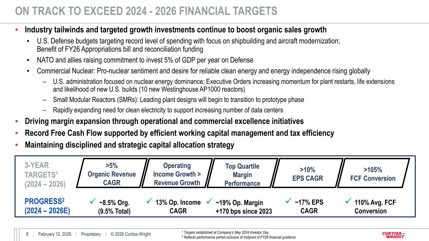 7 | February 12, 2026 | Proprietary | © 2026 Curtiss-Wright 2026 FINANCIAL GUIDANCE (As of February 11, 2026) ($ in Millions, except EPS) 2025 Adjusted 2026E Adjusted Change vs 2025 Adjusted Key Drivers of 2026 Performance Total Sales $3,498 $3,710 - $3,765 6 - 8% Strategically focused on generating profitable growth Total Operating Income $651 $703 - $722 8 - 11% Other Income $30 $33 - $34 ▪ Higher YOY interest income Interest Expense ($43) $(42) - $(41) ▪ $200M 4.24% Sr. Notes due Dec 2026 Tax Rate 21.9% 21.5% ▪ Continued tax optimization Diluted EPS $13.23 $14.70 - $15.15 11 - 15% Targeting EPS growth well in excess of Investor Day target Diluted Shares Outstanding 37.6 37.1 ▪ Benefit of record share repurchases in 2025 ▪ Min. $60M share repurchase in 2026 to offset dilution Free Cash Flow $554 $575 - $595 4 - 7% Continued strong Free Cash Flow generation, incl. Higher Growth CapEx FCF Conversion 111% >105% ▪ FCF conversion in-line with Investor Day target Capital Expenditures $90 $110 - $120 ▪ Accelerated growth investments in 2026; ~30% increase YOY Depreciation & Amortization $114 $115 - $120