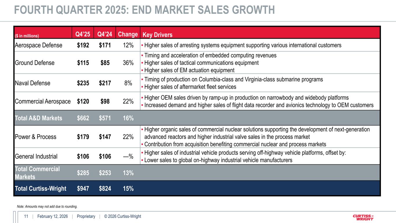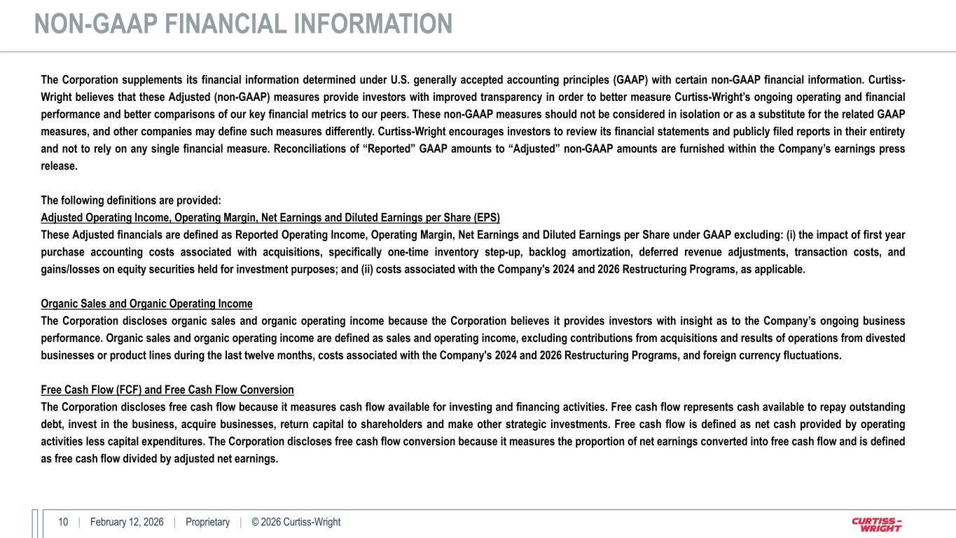10 | February 12, 2026 | Proprietary | © 2026 Curtiss-Wright The Corporation supplements its financial information determined under U.S. generally accepted accounting principles (GAAP) with certain non-GAAP financial information. Curtiss- Wright believes that these Adjusted (non-GAAP) measures provide investors with improved transparency in order to better measure Curtiss-Wright’s ongoing operating and financial performance and better comparisons of our key financial metrics to our peers. These non-GAAP measures should not be considered in isolation or as a substitute for the related GAAP measures, and other companies may define such measures differently. Curtiss-Wright encourages investors to review its financial statements and publicly filed reports in their entirety and not to rely on any single financial measure. Reconciliations of “Reported” GAAP amounts to “Adjusted” non-GAAP amounts are furnished within the Company’s earnings press release. The following definitions are provided: Adjusted Operating Income, Operating Margin, Net Earnings and Diluted Earnings per Share (EPS) These Adjusted financials are defined as Reported Operating Income, Operating Margin, Net Earnings and Diluted Earnings per Share under GAAP excluding: (i) the impact of first year purchase accounting costs associated with acquisitions, specifically one-time inventory step-up, backlog amortization, deferred revenue adjustments, transaction costs, and gains/losses on equity securities held for investment purposes; and (ii) costs associated with the Company's 2024 and 2026 Restructuring Programs, as applicable. Organic Sales and Organic Operating Income The Corporation discloses organic sales and organic operating income because the Corporation believes it provides investors with insight as to the Company’s ongoing business performance. Organic sales and organic operating income are defined as sales and operating income, excluding contributions from acquisitions and results of operations from divested businesses or product lines during the last twelve months, costs associated with the Company's 2024 and 2026 Restructuring Programs, and foreign currency fluctuations. Free Cash Flow (FCF) and Free Cash Flow Conversion The Corporation discloses free cash flow because it measures cash flow available for investing and financing activities. Free cash flow represents cash available to repay outstanding debt, invest in the business, acquire businesses, return capital to shareholders and make other strategic investments. Free cash flow is defined as net cash provided by operating activities less capital expenditures. The Corporation discloses free cash flow conversion because it measures the proportion of net earnings converted into free cash flow and is defined as free cash flow divided by adjusted net earnings. NON-GAAP FINANCIAL INFORMATION