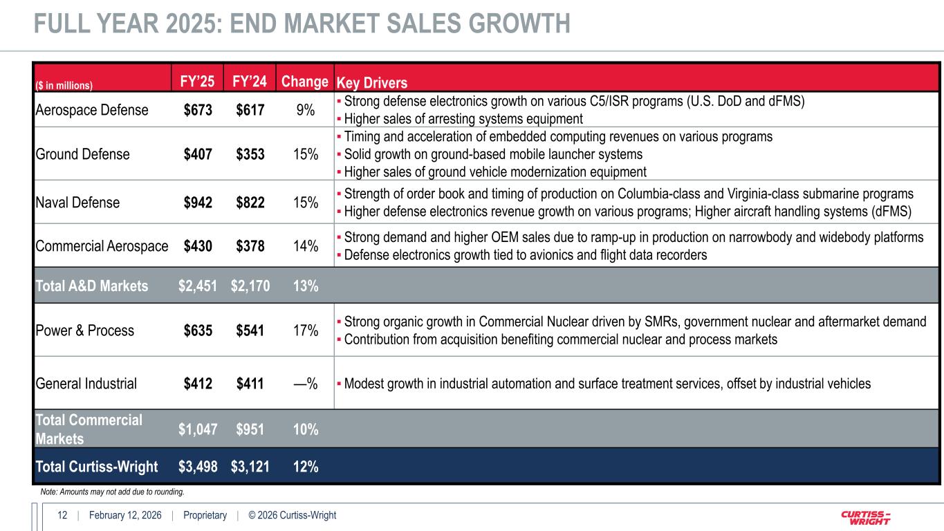11 | February 12, 2026 | Proprietary | © 2026 Curtiss-Wright FOURTH QUARTER 2025: END MARKET SALES GROWTH ($ in millions) Q4’25 Q4’24 Change Key Drivers Aerospace Defense $192 $171 12% ▪ Higher sales of arresting systems equipment supporting various international customers Ground Defense $115 $85 36% ▪ Timing and acceleration of embedded computing revenues ▪ Higher sales of tactical communications equipment ▪ Higher sales of EM actuation equipment Naval Defense $235 $217 8% ▪ Timing of production on Columbia-class and Virginia-class submarine programs ▪ Higher sales of aftermarket fleet services Commercial Aerospace $120 $98 22% ▪ Higher OEM sales driven by ramp-up in production on narrowbody and widebody platforms ▪ Increased demand and higher sales of flight data recorder and avionics technology to OEM customers Total A&D Markets $662 $571 16% Power & Process $179 $147 22% ▪ Higher organic sales of commercial nuclear solutions supporting the development of next-generation advanced reactors and higher industrial valve sales in the process market ▪ Contribution from acquisition benefiting commercial nuclear and process markets General Industrial $106 $106 —% ▪ Higher sales of industrial vehicle products serving off-highway vehicle platforms, offset by: ▪ Lower sales to global on-highway industrial vehicle manufacturers Total Commercial Markets $285 $253 13% Total Curtiss-Wright $947 $824 15% Note: Amounts may not add due to rounding.