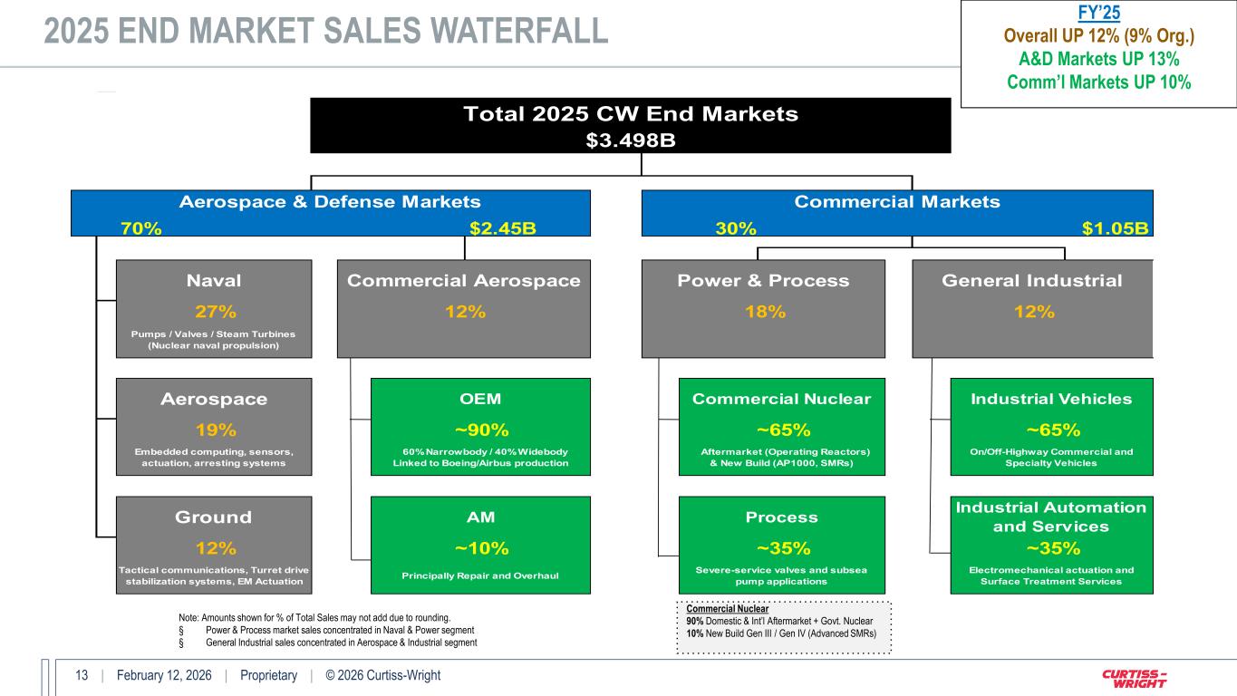 12 | February 12, 2026 | Proprietary | © 2026 Curtiss-Wright FULL YEAR 2025: END MARKET SALES GROWTH ($ in millions) FY’25 FY’24 Change Key Drivers Aerospace Defense $673 $617 9% ▪ Strong defense electronics growth on various C5/ISR programs (U.S. DoD and dFMS) ▪ Higher sales of arresting systems equipment Ground Defense $407 $353 15% ▪ Timing and acceleration of embedded computing revenues on various programs ▪ Solid growth on ground-based mobile launcher systems ▪ Higher sales of ground vehicle modernization equipment Naval Defense $942 $822 15% ▪ Strength of order book and timing of production on Columbia-class and Virginia-class submarine programs ▪ Higher defense electronics revenue growth on various programs; Higher aircraft handling systems (dFMS) Commercial Aerospace $430 $378 14% ▪ Strong demand and higher OEM sales due to ramp-up in production on narrowbody and widebody platforms ▪ Defense electronics growth tied to avionics and flight data recorders Total A&D Markets $2,451 $2,170 13% Power & Process $635 $541 17% ▪ Strong organic growth in Commercial Nuclear driven by SMRs, government nuclear and aftermarket demand ▪ Contribution from acquisition benefiting commercial nuclear and process markets General Industrial $412 $411 —% ▪ Modest growth in industrial automation and surface treatment services, offset by industrial vehicles Total Commercial Markets $1,047 $951 10% Total Curtiss-Wright $3,498 $3,121 12% Note: Amounts may not add due to rounding.