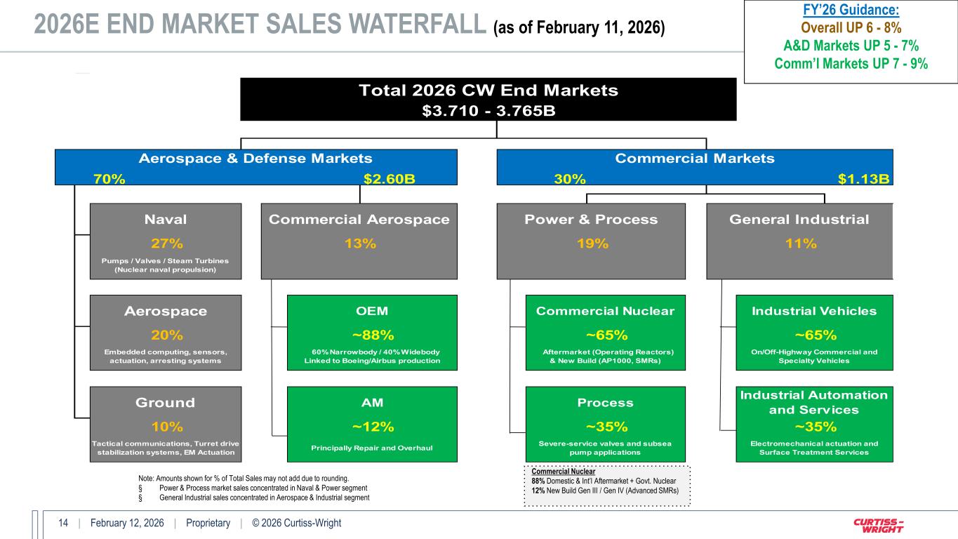 13 | February 12, 2026 | Proprietary | © 2026 Curtiss-Wright 70% $2.45B 30% $1.05B Industrial Vehicles Process Industrial Automation and Services ~35% Total 2025 CW End Markets $3.498B General IndustrialNaval Commercial Aerospace Power & Process Aerospace & Defense Markets Commercial Markets 27% 19% 12% ~90% ~10% Embedded computing, sensors, actuation, arresting systems 60% Narrowbody / 40% Widebody Linked to Boeing/Airbus production Aerospace OEM Pumps / Valves / Steam Turbines (Nuclear naval propulsion) Ground 12% 18% 12% Tactical communications, Turret drive stabilization systems, EM Actuation Principally Repair and Overhaul AM ~35% ~65% Severe-service valves and subsea pump applications ~65% Electromechanical actuation and Surface Treatment Services Aftermarket (Operating Reactors) & New Build (AP1000, SMRs) On/Off-Highway Commercial and Specialty Vehicles Commercial Nuclear 2025 END MARKET SALES WATERFALL Note: Amounts shown for % of Total Sales may not add due to rounding. § Power & Process market sales concentrated in Naval & Power segment § General Industrial sales concentrated in Aerospace & Industrial segment FY’25 Overall UP 12% (9% Org.) A&D Markets UP 13% Comm’l Markets UP 10% Commercial Nuclear 90% Domestic & Int’l Aftermarket + Govt. Nuclear 10% New Build Gen III / Gen IV (Advanced SMRs)