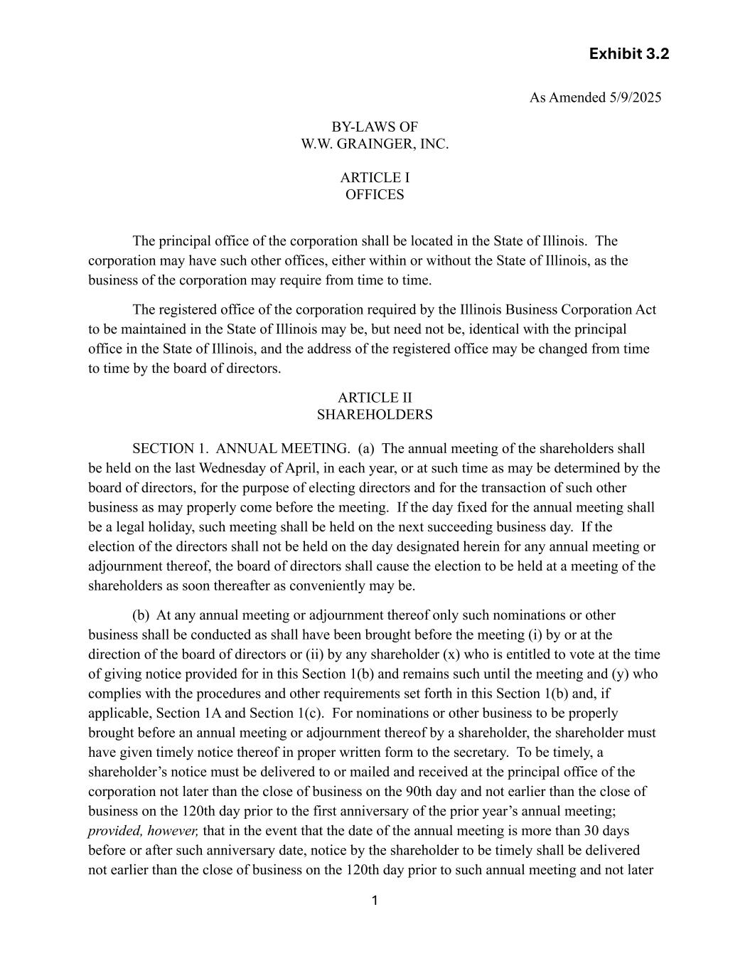 1 As Amended 5/9/2025 BY-LAWS OF W.W. GRAINGER, INC. ARTICLE I OFFICES The principal office of the corporation shall be located in the State of Illinois. The corporation may have such other offices, either within or without the State of Illinois, as the business of the corporation may require from time to time. The registered office of the corporation required by the Illinois Business Corporation Act to be maintained in the State of Illinois may be, but need not be, identical with the principal office in the State of Illinois, and the address of the registered office may be changed from time to time by the board of directors. ARTICLE II SHAREHOLDERS SECTION 1. ANNUAL MEETING. (a) The annual meeting of the shareholders shall be held on the last Wednesday of April, in each year, or at such time as may be determined by the board of directors, for the purpose of electing directors and for the transaction of such other business as may properly come before the meeting. If the day fixed for the annual meeting shall be a legal holiday, such meeting shall be held on the next succeeding business day. If the election of the directors shall not be held on the day designated herein for any annual meeting or adjournment thereof, the board of directors shall cause the election to be held at a meeting of the shareholders as soon thereafter as conveniently may be. (b) At any annual meeting or adjournment thereof only such nominations or other business shall be conducted as shall have been brought before the meeting (i) by or at the direction of the board of directors or (ii) by any shareholder (x) who is entitled to vote at the time of giving notice provided for in this Section 1(b) and remains such until the meeting and (y) who complies with the procedures and other requirements set forth in this Section 1(b) and, if applicable, Section 1A and Section 1(c). For nominations or other business to be properly brought before an annual meeting or adjournment thereof by a shareholder, the shareholder must have given timely notice thereof in proper written form to the secretary. To be timely, a shareholder’s notice must be delivered to or mailed and received at the principal office of the corporation not later than the close of business on the 90th day and not earlier than the close of business on the 120th day prior to the first anniversary of the prior year’s annual meeting; provided, however, that in the event that the date of the annual meeting is more than 30 days before or after such anniversary date, notice by the shareholder to be timely shall be delivered not earlier than the close of business on the 120th day prior to such annual meeting and not later Exhibit 3.2