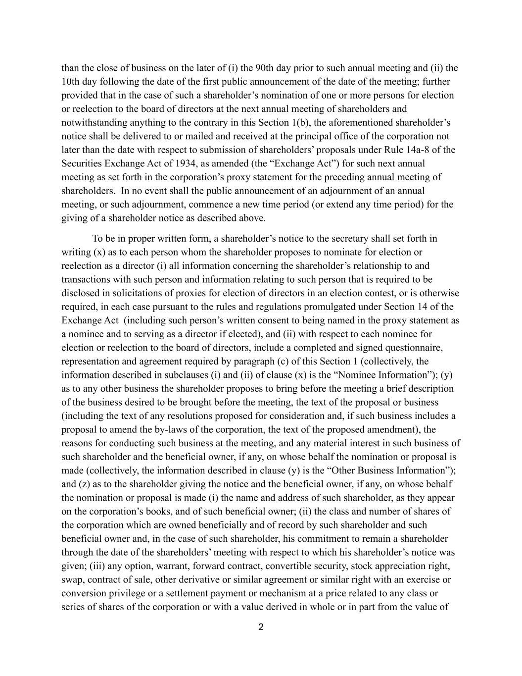 2 than the close of business on the later of (i) the 90th day prior to such annual meeting and (ii) the 10th day following the date of the first public announcement of the date of the meeting; further provided that in the case of such a shareholder’s nomination of one or more persons for election or reelection to the board of directors at the next annual meeting of shareholders and notwithstanding anything to the contrary in this Section 1(b), the aforementioned shareholder’s notice shall be delivered to or mailed and received at the principal office of the corporation not later than the date with respect to submission of shareholders’ proposals under Rule 14a-8 of the Securities Exchange Act of 1934, as amended (the “Exchange Act”) for such next annual meeting as set forth in the corporation’s proxy statement for the preceding annual meeting of shareholders. In no event shall the public announcement of an adjournment of an annual meeting, or such adjournment, commence a new time period (or extend any time period) for the giving of a shareholder notice as described above. To be in proper written form, a shareholder’s notice to the secretary shall set forth in writing (x) as to each person whom the shareholder proposes to nominate for election or reelection as a director (i) all information concerning the shareholder’s relationship to and transactions with such person and information relating to such person that is required to be disclosed in solicitations of proxies for election of directors in an election contest, or is otherwise required, in each case pursuant to the rules and regulations promulgated under Section 14 of the Exchange Act (including such person’s written consent to being named in the proxy statement as a nominee and to serving as a director if elected), and (ii) with respect to each nominee for election or reelection to the board of directors, include a completed and signed questionnaire, representation and agreement required by paragraph (c) of this Section 1 (collectively, the information described in subclauses (i) and (ii) of clause (x) is the “Nominee Information”); (y) as to any other business the shareholder proposes to bring before the meeting a brief description of the business desired to be brought before the meeting, the text of the proposal or business (including the text of any resolutions proposed for consideration and, if such business includes a proposal to amend the by-laws of the corporation, the text of the proposed amendment), the reasons for conducting such business at the meeting, and any material interest in such business of such shareholder and the beneficial owner, if any, on whose behalf the nomination or proposal is made (collectively, the information described in clause (y) is the “Other Business Information”); and (z) as to the shareholder giving the notice and the beneficial owner, if any, on whose behalf the nomination or proposal is made (i) the name and address of such shareholder, as they appear on the corporation’s books, and of such beneficial owner; (ii) the class and number of shares of the corporation which are owned beneficially and of record by such shareholder and such beneficial owner and, in the case of such shareholder, his commitment to remain a shareholder through the date of the shareholders’ meeting with respect to which his shareholder’s notice was given; (iii) any option, warrant, forward contract, convertible security, stock appreciation right, swap, contract of sale, other derivative or similar agreement or similar right with an exercise or conversion privilege or a settlement payment or mechanism at a price related to any class or series of shares of the corporation or with a value derived in whole or in part from the value of