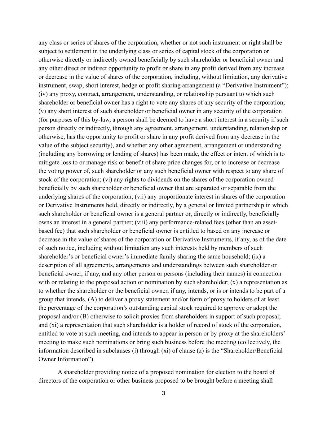 3 any class or series of shares of the corporation, whether or not such instrument or right shall be subject to settlement in the underlying class or series of capital stock of the corporation or otherwise directly or indirectly owned beneficially by such shareholder or beneficial owner and any other direct or indirect opportunity to profit or share in any profit derived from any increase or decrease in the value of shares of the corporation, including, without limitation, any derivative instrument, swap, short interest, hedge or profit sharing arrangement (a “Derivative Instrument”); (iv) any proxy, contract, arrangement, understanding, or relationship pursuant to which such shareholder or beneficial owner has a right to vote any shares of any security of the corporation; (v) any short interest of such shareholder or beneficial owner in any security of the corporation (for purposes of this by-law, a person shall be deemed to have a short interest in a security if such person directly or indirectly, through any agreement, arrangement, understanding, relationship or otherwise, has the opportunity to profit or share in any profit derived from any decrease in the value of the subject security), and whether any other agreement, arrangement or understanding (including any borrowing or lending of shares) has been made, the effect or intent of which is to mitigate loss to or manage risk or benefit of share price changes for, or to increase or decrease the voting power of, such shareholder or any such beneficial owner with respect to any share of stock of the corporation; (vi) any rights to dividends on the shares of the corporation owned beneficially by such shareholder or beneficial owner that are separated or separable from the underlying shares of the corporation; (vii) any proportionate interest in shares of the corporation or Derivative Instruments held, directly or indirectly, by a general or limited partnership in which such shareholder or beneficial owner is a general partner or, directly or indirectly, beneficially owns an interest in a general partner; (viii) any performance-related fees (other than an asset- based fee) that such shareholder or beneficial owner is entitled to based on any increase or decrease in the value of shares of the corporation or Derivative Instruments, if any, as of the date of such notice, including without limitation any such interests held by members of such shareholder’s or beneficial owner’s immediate family sharing the same household; (ix) a description of all agreements, arrangements and understandings between such shareholder or beneficial owner, if any, and any other person or persons (including their names) in connection with or relating to the proposed action or nomination by such shareholder; (x) a representation as to whether the shareholder or the beneficial owner, if any, intends, or is or intends to be part of a group that intends, (A) to deliver a proxy statement and/or form of proxy to holders of at least the percentage of the corporation’s outstanding capital stock required to approve or adopt the proposal and/or (B) otherwise to solicit proxies from shareholders in support of such proposal; and (xi) a representation that such shareholder is a holder of record of stock of the corporation, entitled to vote at such meeting, and intends to appear in person or by proxy at the shareholders’ meeting to make such nominations or bring such business before the meeting (collectively, the information described in subclauses (i) through (xi) of clause (z) is the “Shareholder/Beneficial Owner Information”). A shareholder providing notice of a proposed nomination for election to the board of directors of the corporation or other business proposed to be brought before a meeting shall