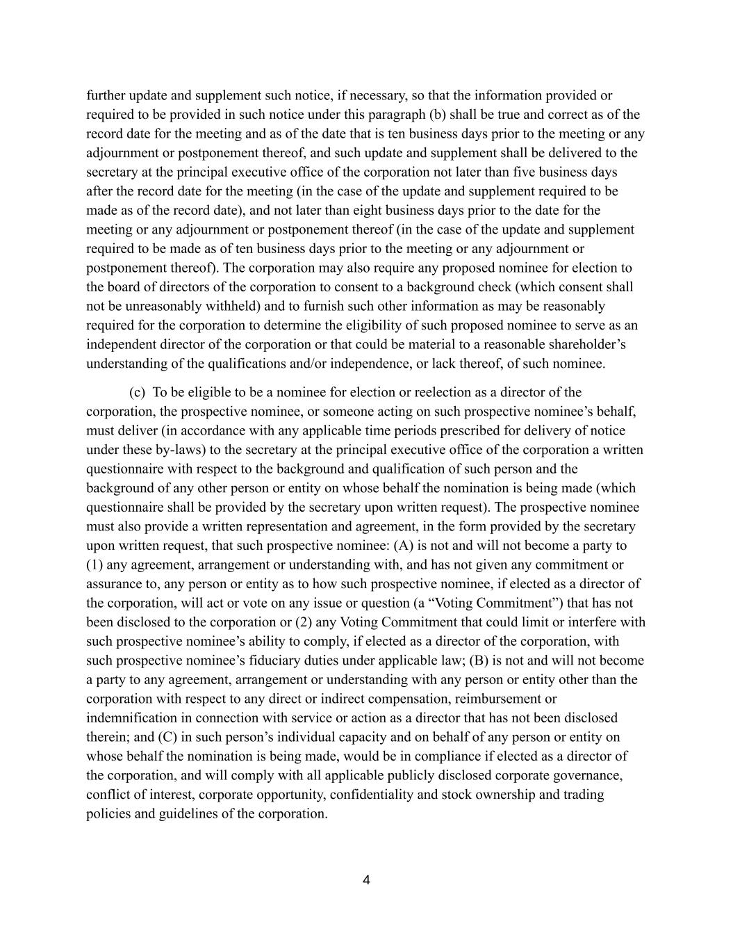 4 further update and supplement such notice, if necessary, so that the information provided or required to be provided in such notice under this paragraph (b) shall be true and correct as of the record date for the meeting and as of the date that is ten business days prior to the meeting or any adjournment or postponement thereof, and such update and supplement shall be delivered to the secretary at the principal executive office of the corporation not later than five business days after the record date for the meeting (in the case of the update and supplement required to be made as of the record date), and not later than eight business days prior to the date for the meeting or any adjournment or postponement thereof (in the case of the update and supplement required to be made as of ten business days prior to the meeting or any adjournment or postponement thereof). The corporation may also require any proposed nominee for election to the board of directors of the corporation to consent to a background check (which consent shall not be unreasonably withheld) and to furnish such other information as may be reasonably required for the corporation to determine the eligibility of such proposed nominee to serve as an independent director of the corporation or that could be material to a reasonable shareholder’s understanding of the qualifications and/or independence, or lack thereof, of such nominee. (c) To be eligible to be a nominee for election or reelection as a director of the corporation, the prospective nominee, or someone acting on such prospective nominee’s behalf, must deliver (in accordance with any applicable time periods prescribed for delivery of notice under these by-laws) to the secretary at the principal executive office of the corporation a written questionnaire with respect to the background and qualification of such person and the background of any other person or entity on whose behalf the nomination is being made (which questionnaire shall be provided by the secretary upon written request). The prospective nominee must also provide a written representation and agreement, in the form provided by the secretary upon written request, that such prospective nominee: (A) is not and will not become a party to (1) any agreement, arrangement or understanding with, and has not given any commitment or assurance to, any person or entity as to how such prospective nominee, if elected as a director of the corporation, will act or vote on any issue or question (a “Voting Commitment”) that has not been disclosed to the corporation or (2) any Voting Commitment that could limit or interfere with such prospective nominee’s ability to comply, if elected as a director of the corporation, with such prospective nominee’s fiduciary duties under applicable law; (B) is not and will not become a party to any agreement, arrangement or understanding with any person or entity other than the corporation with respect to any direct or indirect compensation, reimbursement or indemnification in connection with service or action as a director that has not been disclosed therein; and (C) in such person’s individual capacity and on behalf of any person or entity on whose behalf the nomination is being made, would be in compliance if elected as a director of the corporation, and will comply with all applicable publicly disclosed corporate governance, conflict of interest, corporate opportunity, confidentiality and stock ownership and trading policies and guidelines of the corporation.