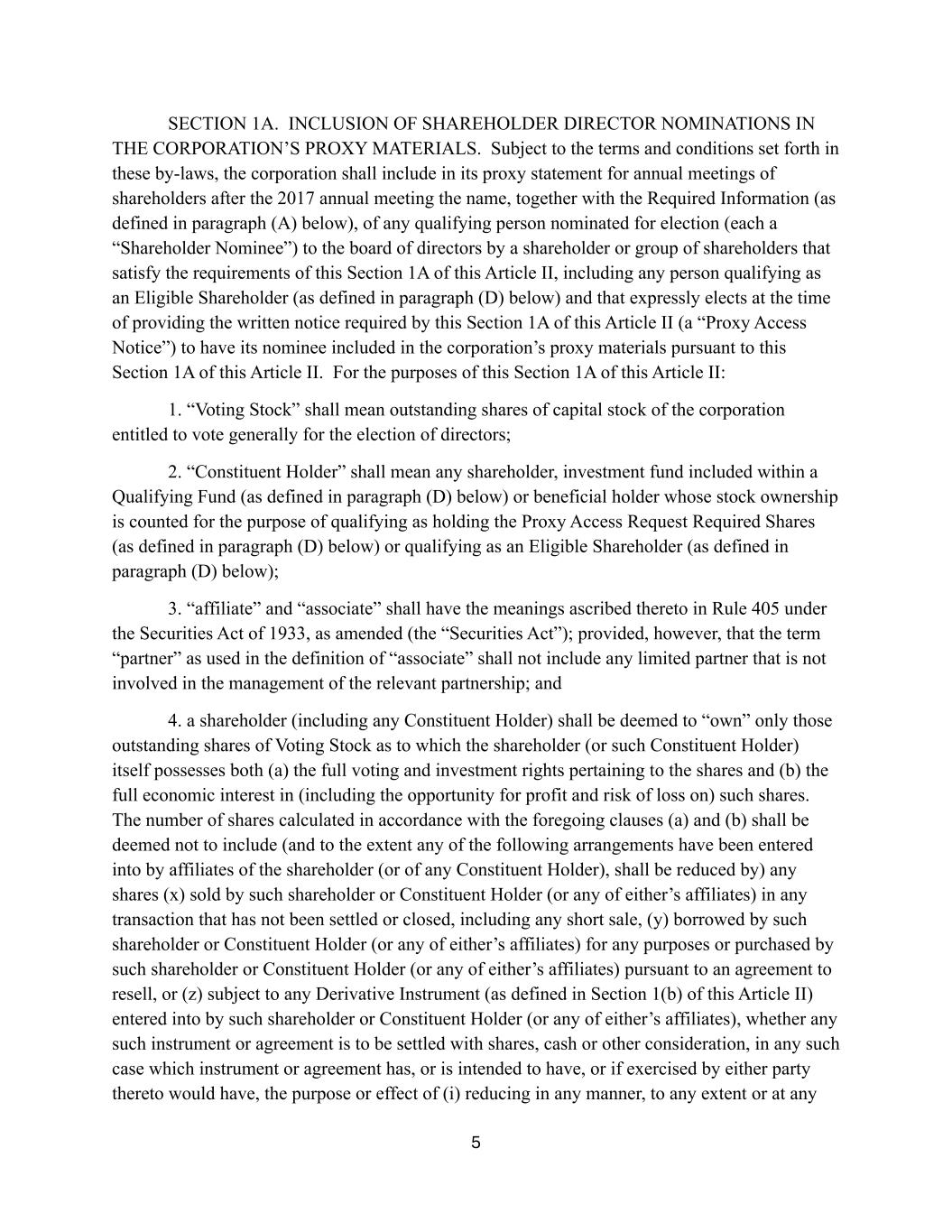 5 SECTION 1A. INCLUSION OF SHAREHOLDER DIRECTOR NOMINATIONS IN THE CORPORATION’S PROXY MATERIALS. Subject to the terms and conditions set forth in these by-laws, the corporation shall include in its proxy statement for annual meetings of shareholders after the 2017 annual meeting the name, together with the Required Information (as defined in paragraph (A) below), of any qualifying person nominated for election (each a “Shareholder Nominee”) to the board of directors by a shareholder or group of shareholders that satisfy the requirements of this Section 1A of this Article II, including any person qualifying as an Eligible Shareholder (as defined in paragraph (D) below) and that expressly elects at the time of providing the written notice required by this Section 1A of this Article II (a “Proxy Access Notice”) to have its nominee included in the corporation’s proxy materials pursuant to this Section 1A of this Article II. For the purposes of this Section 1A of this Article II: 1. “Voting Stock” shall mean outstanding shares of capital stock of the corporation entitled to vote generally for the election of directors; 2. “Constituent Holder” shall mean any shareholder, investment fund included within a Qualifying Fund (as defined in paragraph (D) below) or beneficial holder whose stock ownership is counted for the purpose of qualifying as holding the Proxy Access Request Required Shares (as defined in paragraph (D) below) or qualifying as an Eligible Shareholder (as defined in paragraph (D) below); 3. “affiliate” and “associate” shall have the meanings ascribed thereto in Rule 405 under the Securities Act of 1933, as amended (the “Securities Act”); provided, however, that the term “partner” as used in the definition of “associate” shall not include any limited partner that is not involved in the management of the relevant partnership; and 4. a shareholder (including any Constituent Holder) shall be deemed to “own” only those outstanding shares of Voting Stock as to which the shareholder (or such Constituent Holder) itself possesses both (a) the full voting and investment rights pertaining to the shares and (b) the full economic interest in (including the opportunity for profit and risk of loss on) such shares. The number of shares calculated in accordance with the foregoing clauses (a) and (b) shall be deemed not to include (and to the extent any of the following arrangements have been entered into by affiliates of the shareholder (or of any Constituent Holder), shall be reduced by) any shares (x) sold by such shareholder or Constituent Holder (or any of either’s affiliates) in any transaction that has not been settled or closed, including any short sale, (y) borrowed by such shareholder or Constituent Holder (or any of either’s affiliates) for any purposes or purchased by such shareholder or Constituent Holder (or any of either’s affiliates) pursuant to an agreement to resell, or (z) subject to any Derivative Instrument (as defined in Section 1(b) of this Article II) entered into by such shareholder or Constituent Holder (or any of either’s affiliates), whether any such instrument or agreement is to be settled with shares, cash or other consideration, in any such case which instrument or agreement has, or is intended to have, or if exercised by either party thereto would have, the purpose or effect of (i) reducing in any manner, to any extent or at any