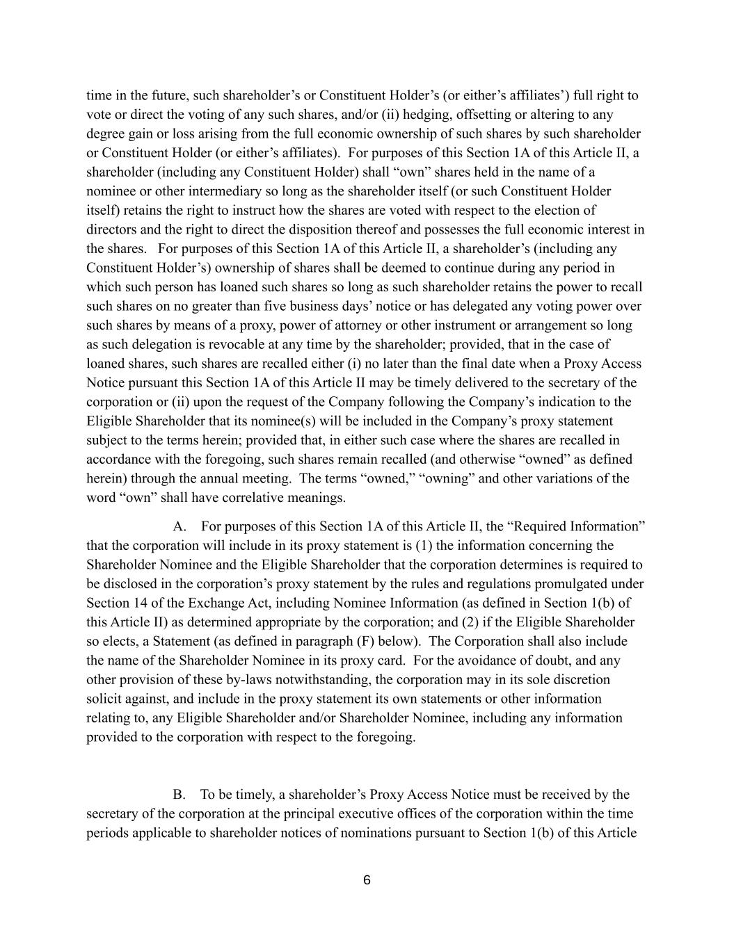 6 time in the future, such shareholder’s or Constituent Holder’s (or either’s affiliates’) full right to vote or direct the voting of any such shares, and/or (ii) hedging, offsetting or altering to any degree gain or loss arising from the full economic ownership of such shares by such shareholder or Constituent Holder (or either’s affiliates). For purposes of this Section 1A of this Article II, a shareholder (including any Constituent Holder) shall “own” shares held in the name of a nominee or other intermediary so long as the shareholder itself (or such Constituent Holder itself) retains the right to instruct how the shares are voted with respect to the election of directors and the right to direct the disposition thereof and possesses the full economic interest in the shares. For purposes of this Section 1A of this Article II, a shareholder’s (including any Constituent Holder’s) ownership of shares shall be deemed to continue during any period in which such person has loaned such shares so long as such shareholder retains the power to recall such shares on no greater than five business days’ notice or has delegated any voting power over such shares by means of a proxy, power of attorney or other instrument or arrangement so long as such delegation is revocable at any time by the shareholder; provided, that in the case of loaned shares, such shares are recalled either (i) no later than the final date when a Proxy Access Notice pursuant this Section 1A of this Article II may be timely delivered to the secretary of the corporation or (ii) upon the request of the Company following the Company’s indication to the Eligible Shareholder that its nominee(s) will be included in the Company’s proxy statement subject to the terms herein; provided that, in either such case where the shares are recalled in accordance with the foregoing, such shares remain recalled (and otherwise “owned” as defined herein) through the annual meeting. The terms “owned,” “owning” and other variations of the word “own” shall have correlative meanings. A. For purposes of this Section 1A of this Article II, the “Required Information” that the corporation will include in its proxy statement is (1) the information concerning the Shareholder Nominee and the Eligible Shareholder that the corporation determines is required to be disclosed in the corporation’s proxy statement by the rules and regulations promulgated under Section 14 of the Exchange Act, including Nominee Information (as defined in Section 1(b) of this Article II) as determined appropriate by the corporation; and (2) if the Eligible Shareholder so elects, a Statement (as defined in paragraph (F) below). The Corporation shall also include the name of the Shareholder Nominee in its proxy card. For the avoidance of doubt, and any other provision of these by-laws notwithstanding, the corporation may in its sole discretion solicit against, and include in the proxy statement its own statements or other information relating to, any Eligible Shareholder and/or Shareholder Nominee, including any information provided to the corporation with respect to the foregoing. B. To be timely, a shareholder’s Proxy Access Notice must be received by the secretary of the corporation at the principal executive offices of the corporation within the time periods applicable to shareholder notices of nominations pursuant to Section 1(b) of this Article