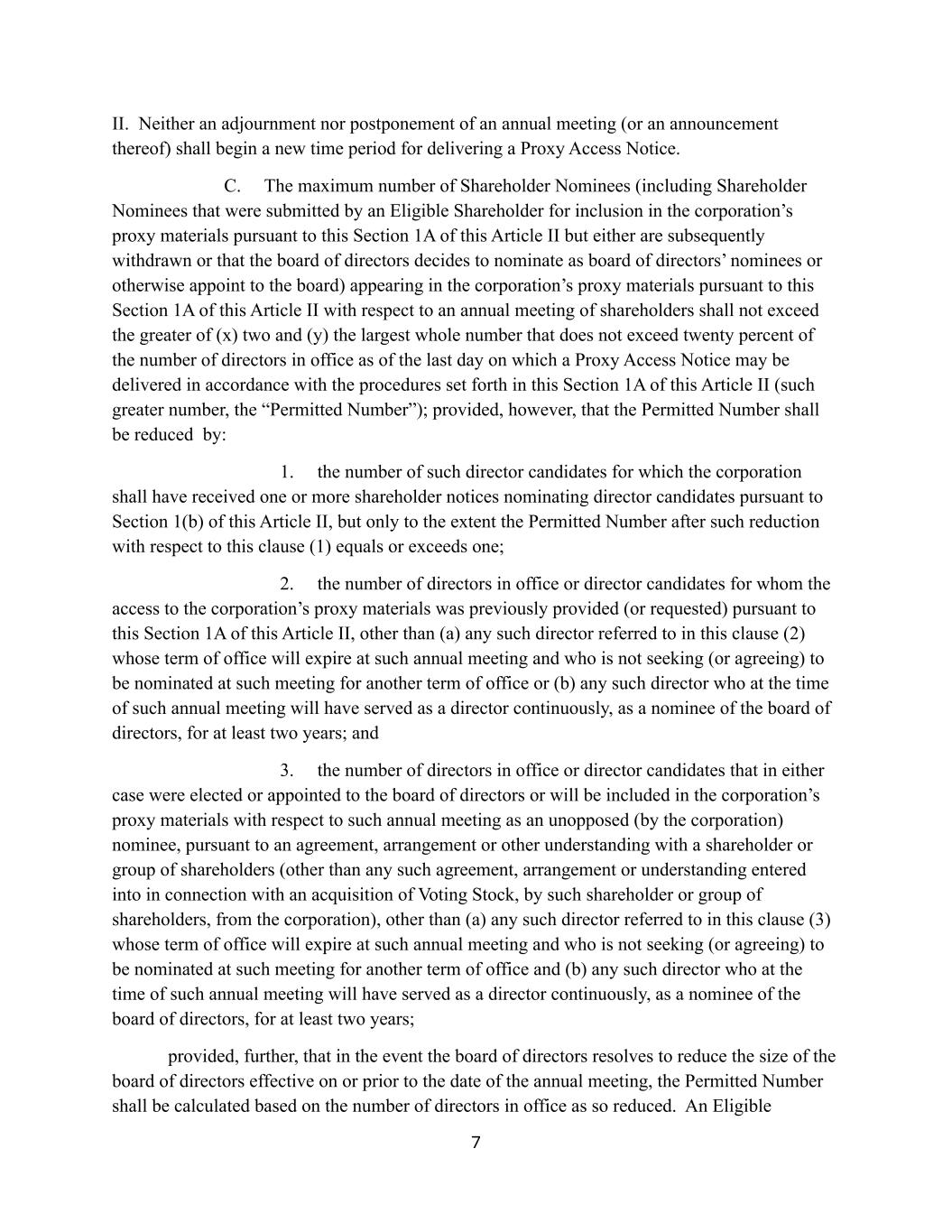 7 II. Neither an adjournment nor postponement of an annual meeting (or an announcement thereof) shall begin a new time period for delivering a Proxy Access Notice. C. The maximum number of Shareholder Nominees (including Shareholder Nominees that were submitted by an Eligible Shareholder for inclusion in the corporation’s proxy materials pursuant to this Section 1A of this Article II but either are subsequently withdrawn or that the board of directors decides to nominate as board of directors’ nominees or otherwise appoint to the board) appearing in the corporation’s proxy materials pursuant to this Section 1A of this Article II with respect to an annual meeting of shareholders shall not exceed the greater of (x) two and (y) the largest whole number that does not exceed twenty percent of the number of directors in office as of the last day on which a Proxy Access Notice may be delivered in accordance with the procedures set forth in this Section 1A of this Article II (such greater number, the “Permitted Number”); provided, however, that the Permitted Number shall be reduced by: 1. the number of such director candidates for which the corporation shall have received one or more shareholder notices nominating director candidates pursuant to Section 1(b) of this Article II, but only to the extent the Permitted Number after such reduction with respect to this clause (1) equals or exceeds one; 2. the number of directors in office or director candidates for whom the access to the corporation’s proxy materials was previously provided (or requested) pursuant to this Section 1A of this Article II, other than (a) any such director referred to in this clause (2) whose term of office will expire at such annual meeting and who is not seeking (or agreeing) to be nominated at such meeting for another term of office or (b) any such director who at the time of such annual meeting will have served as a director continuously, as a nominee of the board of directors, for at least two years; and 3. the number of directors in office or director candidates that in either case were elected or appointed to the board of directors or will be included in the corporation’s proxy materials with respect to such annual meeting as an unopposed (by the corporation) nominee, pursuant to an agreement, arrangement or other understanding with a shareholder or group of shareholders (other than any such agreement, arrangement or understanding entered into in connection with an acquisition of Voting Stock, by such shareholder or group of shareholders, from the corporation), other than (a) any such director referred to in this clause (3) whose term of office will expire at such annual meeting and who is not seeking (or agreeing) to be nominated at such meeting for another term of office and (b) any such director who at the time of such annual meeting will have served as a director continuously, as a nominee of the board of directors, for at least two years; provided, further, that in the event the board of directors resolves to reduce the size of the board of directors effective on or prior to the date of the annual meeting, the Permitted Number shall be calculated based on the number of directors in office as so reduced. An Eligible