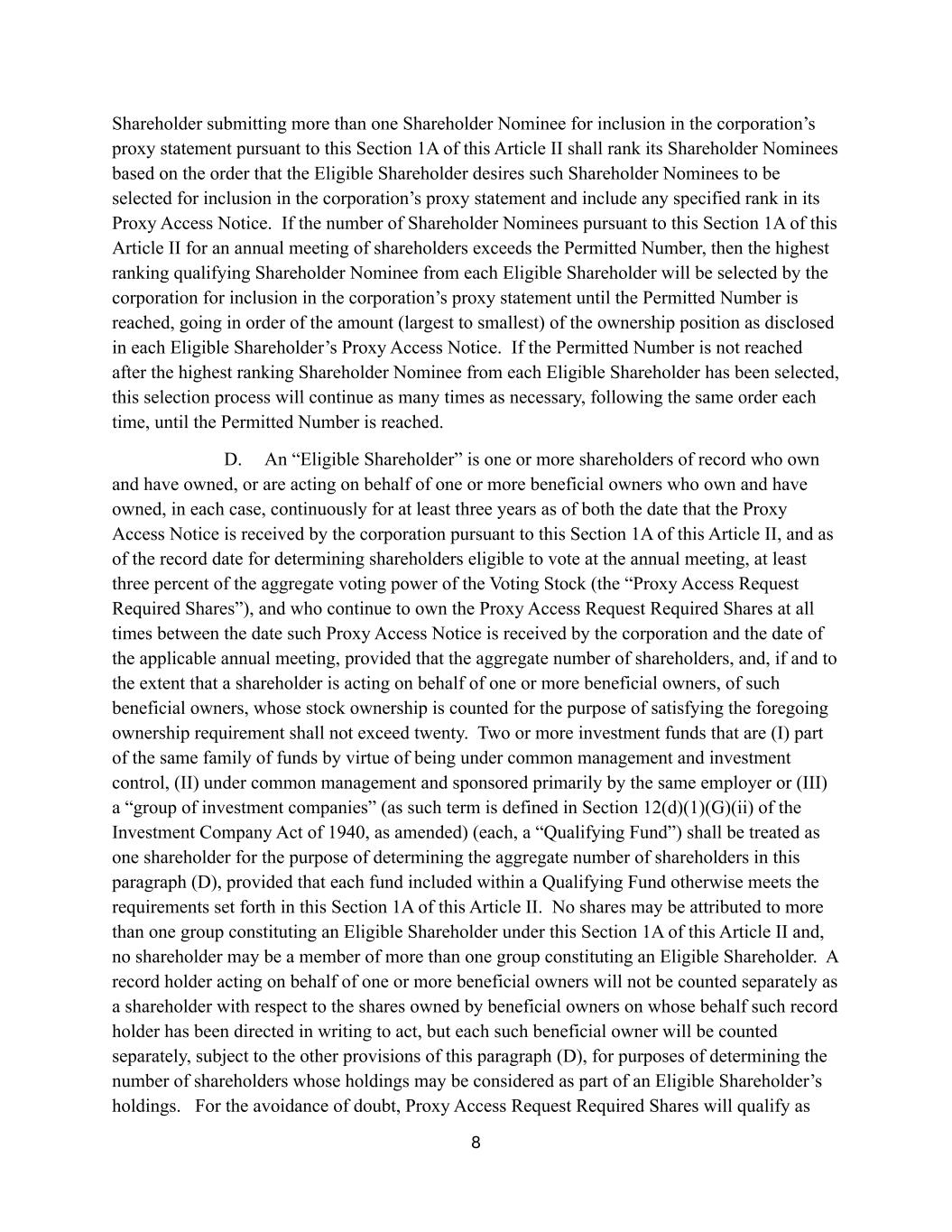 8 Shareholder submitting more than one Shareholder Nominee for inclusion in the corporation’s proxy statement pursuant to this Section 1A of this Article II shall rank its Shareholder Nominees based on the order that the Eligible Shareholder desires such Shareholder Nominees to be selected for inclusion in the corporation’s proxy statement and include any specified rank in its Proxy Access Notice. If the number of Shareholder Nominees pursuant to this Section 1A of this Article II for an annual meeting of shareholders exceeds the Permitted Number, then the highest ranking qualifying Shareholder Nominee from each Eligible Shareholder will be selected by the corporation for inclusion in the corporation’s proxy statement until the Permitted Number is reached, going in order of the amount (largest to smallest) of the ownership position as disclosed in each Eligible Shareholder’s Proxy Access Notice. If the Permitted Number is not reached after the highest ranking Shareholder Nominee from each Eligible Shareholder has been selected, this selection process will continue as many times as necessary, following the same order each time, until the Permitted Number is reached. D. An “Eligible Shareholder” is one or more shareholders of record who own and have owned, or are acting on behalf of one or more beneficial owners who own and have owned, in each case, continuously for at least three years as of both the date that the Proxy Access Notice is received by the corporation pursuant to this Section 1A of this Article II, and as of the record date for determining shareholders eligible to vote at the annual meeting, at least three percent of the aggregate voting power of the Voting Stock (the “Proxy Access Request Required Shares”), and who continue to own the Proxy Access Request Required Shares at all times between the date such Proxy Access Notice is received by the corporation and the date of the applicable annual meeting, provided that the aggregate number of shareholders, and, if and to the extent that a shareholder is acting on behalf of one or more beneficial owners, of such beneficial owners, whose stock ownership is counted for the purpose of satisfying the foregoing ownership requirement shall not exceed twenty. Two or more investment funds that are (I) part of the same family of funds by virtue of being under common management and investment control, (II) under common management and sponsored primarily by the same employer or (III) a “group of investment companies” (as such term is defined in Section 12(d)(1)(G)(ii) of the Investment Company Act of 1940, as amended) (each, a “Qualifying Fund”) shall be treated as one shareholder for the purpose of determining the aggregate number of shareholders in this paragraph (D), provided that each fund included within a Qualifying Fund otherwise meets the requirements set forth in this Section 1A of this Article II. No shares may be attributed to more than one group constituting an Eligible Shareholder under this Section 1A of this Article II and, no shareholder may be a member of more than one group constituting an Eligible Shareholder. A record holder acting on behalf of one or more beneficial owners will not be counted separately as a shareholder with respect to the shares owned by beneficial owners on whose behalf such record holder has been directed in writing to act, but each such beneficial owner will be counted separately, subject to the other provisions of this paragraph (D), for purposes of determining the number of shareholders whose holdings may be considered as part of an Eligible Shareholder’s holdings. For the avoidance of doubt, Proxy Access Request Required Shares will qualify as