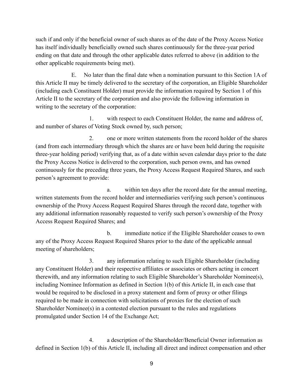 9 such if and only if the beneficial owner of such shares as of the date of the Proxy Access Notice has itself individually beneficially owned such shares continuously for the three-year period ending on that date and through the other applicable dates referred to above (in addition to the other applicable requirements being met). E. No later than the final date when a nomination pursuant to this Section 1A of this Article II may be timely delivered to the secretary of the corporation, an Eligible Shareholder (including each Constituent Holder) must provide the information required by Section 1 of this Article II to the secretary of the corporation and also provide the following information in writing to the secretary of the corporation: 1. with respect to each Constituent Holder, the name and address of, and number of shares of Voting Stock owned by, such person; 2. one or more written statements from the record holder of the shares (and from each intermediary through which the shares are or have been held during the requisite three-year holding period) verifying that, as of a date within seven calendar days prior to the date the Proxy Access Notice is delivered to the corporation, such person owns, and has owned continuously for the preceding three years, the Proxy Access Request Required Shares, and such person’s agreement to provide: a. within ten days after the record date for the annual meeting, written statements from the record holder and intermediaries verifying such person’s continuous ownership of the Proxy Access Request Required Shares through the record date, together with any additional information reasonably requested to verify such person’s ownership of the Proxy Access Request Required Shares; and b. immediate notice if the Eligible Shareholder ceases to own any of the Proxy Access Request Required Shares prior to the date of the applicable annual meeting of shareholders; 3. any information relating to such Eligible Shareholder (including any Constituent Holder) and their respective affiliates or associates or others acting in concert therewith, and any information relating to such Eligible Shareholder’s Shareholder Nominee(s), including Nominee Information as defined in Section 1(b) of this Article II, in each case that would be required to be disclosed in a proxy statement and form of proxy or other filings required to be made in connection with solicitations of proxies for the election of such Shareholder Nominee(s) in a contested election pursuant to the rules and regulations promulgated under Section 14 of the Exchange Act; 4. a description of the Shareholder/Beneficial Owner information as defined in Section 1(b) of this Article II, including all direct and indirect compensation and other