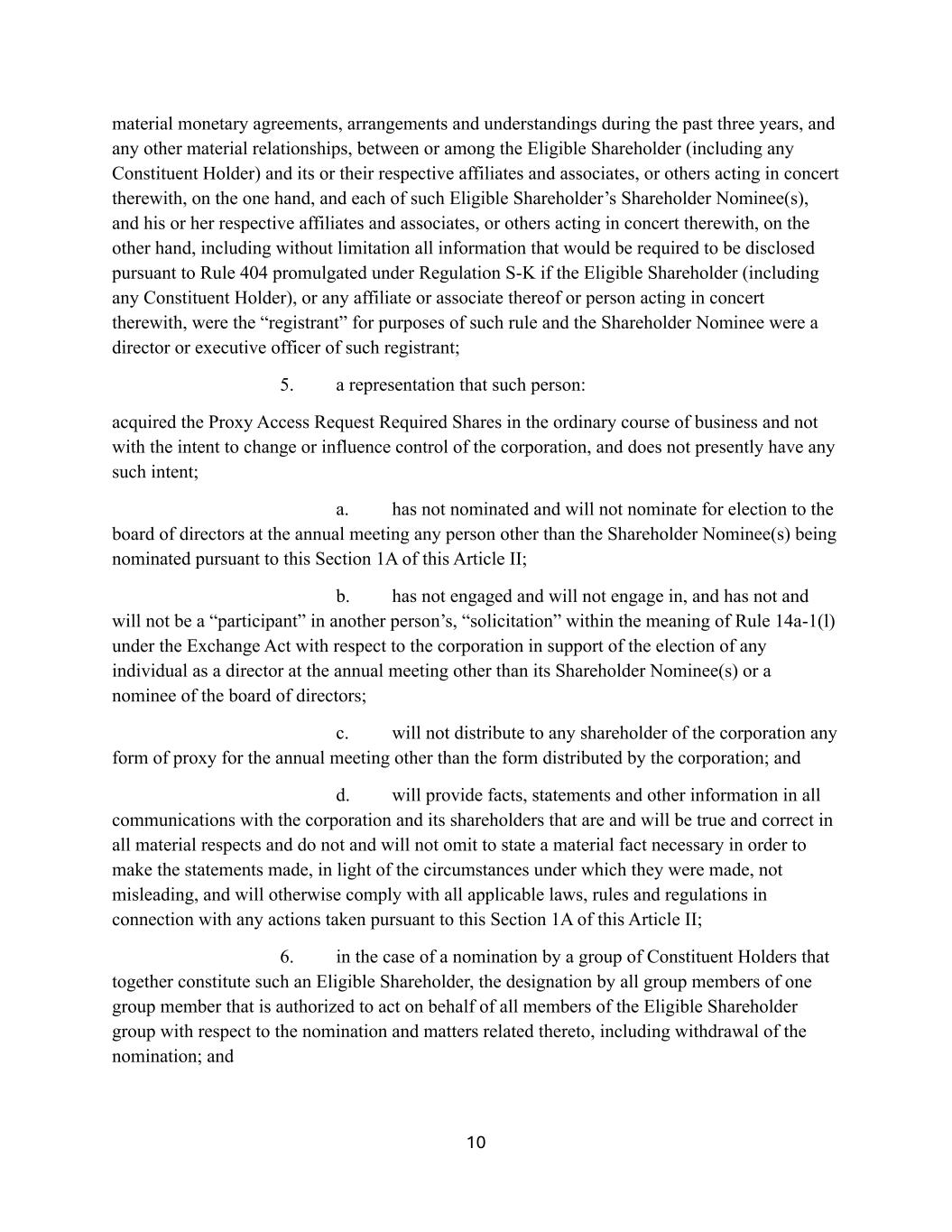 10 material monetary agreements, arrangements and understandings during the past three years, and any other material relationships, between or among the Eligible Shareholder (including any Constituent Holder) and its or their respective affiliates and associates, or others acting in concert therewith, on the one hand, and each of such Eligible Shareholder’s Shareholder Nominee(s), and his or her respective affiliates and associates, or others acting in concert therewith, on the other hand, including without limitation all information that would be required to be disclosed pursuant to Rule 404 promulgated under Regulation S-K if the Eligible Shareholder (including any Constituent Holder), or any affiliate or associate thereof or person acting in concert therewith, were the “registrant” for purposes of such rule and the Shareholder Nominee were a director or executive officer of such registrant; 5. a representation that such person: acquired the Proxy Access Request Required Shares in the ordinary course of business and not with the intent to change or influence control of the corporation, and does not presently have any such intent; a. has not nominated and will not nominate for election to the board of directors at the annual meeting any person other than the Shareholder Nominee(s) being nominated pursuant to this Section 1A of this Article II; b. has not engaged and will not engage in, and has not and will not be a “participant” in another person’s, “solicitation” within the meaning of Rule 14a-1(l) under the Exchange Act with respect to the corporation in support of the election of any individual as a director at the annual meeting other than its Shareholder Nominee(s) or a nominee of the board of directors; c. will not distribute to any shareholder of the corporation any form of proxy for the annual meeting other than the form distributed by the corporation; and d. will provide facts, statements and other information in all communications with the corporation and its shareholders that are and will be true and correct in all material respects and do not and will not omit to state a material fact necessary in order to make the statements made, in light of the circumstances under which they were made, not misleading, and will otherwise comply with all applicable laws, rules and regulations in connection with any actions taken pursuant to this Section 1A of this Article II; 6. in the case of a nomination by a group of Constituent Holders that together constitute such an Eligible Shareholder, the designation by all group members of one group member that is authorized to act on behalf of all members of the Eligible Shareholder group with respect to the nomination and matters related thereto, including withdrawal of the nomination; and