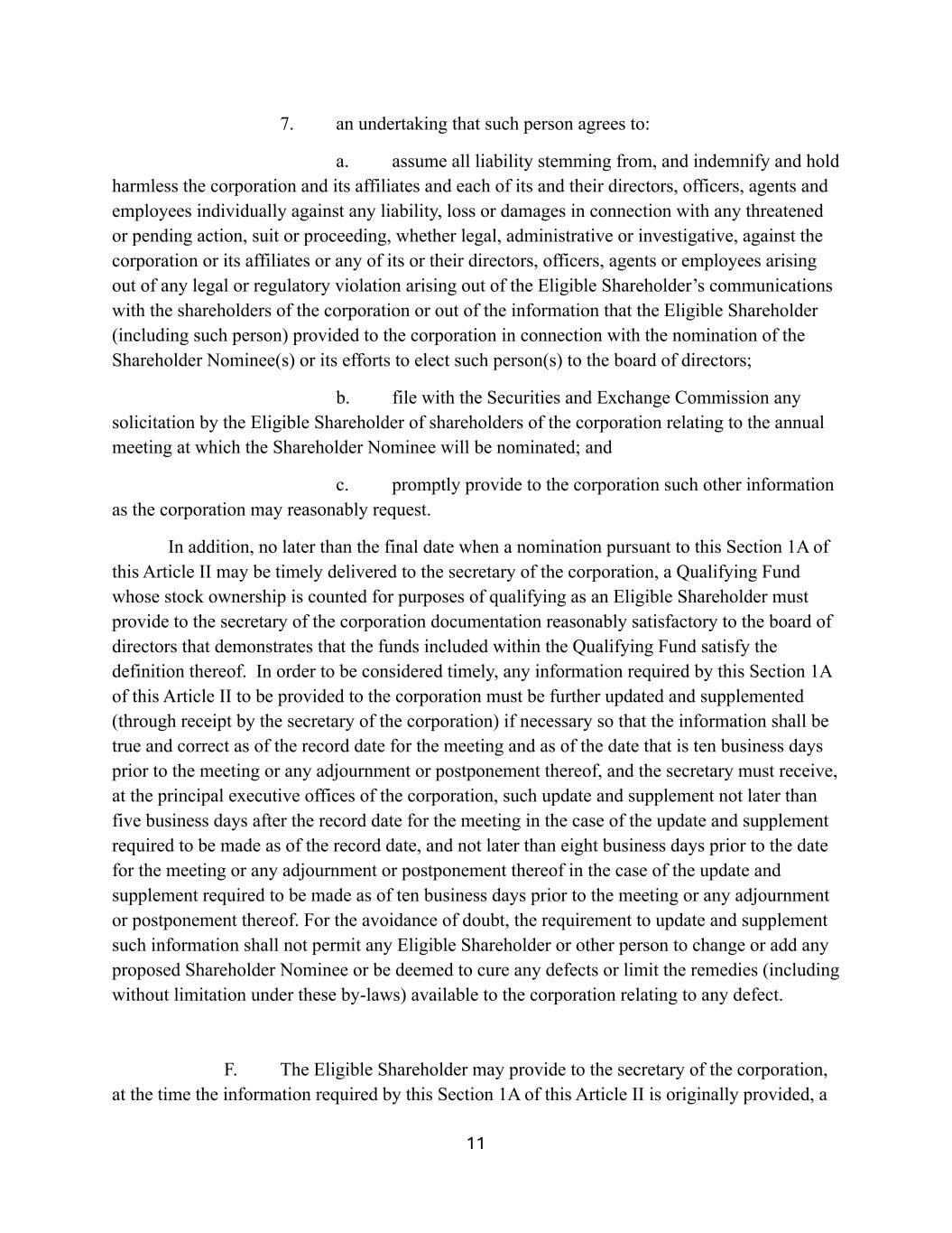 11 7. an undertaking that such person agrees to: a. assume all liability stemming from, and indemnify and hold harmless the corporation and its affiliates and each of its and their directors, officers, agents and employees individually against any liability, loss or damages in connection with any threatened or pending action, suit or proceeding, whether legal, administrative or investigative, against the corporation or its affiliates or any of its or their directors, officers, agents or employees arising out of any legal or regulatory violation arising out of the Eligible Shareholder’s communications with the shareholders of the corporation or out of the information that the Eligible Shareholder (including such person) provided to the corporation in connection with the nomination of the Shareholder Nominee(s) or its efforts to elect such person(s) to the board of directors; b. file with the Securities and Exchange Commission any solicitation by the Eligible Shareholder of shareholders of the corporation relating to the annual meeting at which the Shareholder Nominee will be nominated; and c. promptly provide to the corporation such other information as the corporation may reasonably request. In addition, no later than the final date when a nomination pursuant to this Section 1A of this Article II may be timely delivered to the secretary of the corporation, a Qualifying Fund whose stock ownership is counted for purposes of qualifying as an Eligible Shareholder must provide to the secretary of the corporation documentation reasonably satisfactory to the board of directors that demonstrates that the funds included within the Qualifying Fund satisfy the definition thereof. In order to be considered timely, any information required by this Section 1A of this Article II to be provided to the corporation must be further updated and supplemented (through receipt by the secretary of the corporation) if necessary so that the information shall be true and correct as of the record date for the meeting and as of the date that is ten business days prior to the meeting or any adjournment or postponement thereof, and the secretary must receive, at the principal executive offices of the corporation, such update and supplement not later than five business days after the record date for the meeting in the case of the update and supplement required to be made as of the record date, and not later than eight business days prior to the date for the meeting or any adjournment or postponement thereof in the case of the update and supplement required to be made as of ten business days prior to the meeting or any adjournment or postponement thereof. For the avoidance of doubt, the requirement to update and supplement such information shall not permit any Eligible Shareholder or other person to change or add any proposed Shareholder Nominee or be deemed to cure any defects or limit the remedies (including without limitation under these by-laws) available to the corporation relating to any defect. F. The Eligible Shareholder may provide to the secretary of the corporation, at the time the information required by this Section 1A of this Article II is originally provided, a