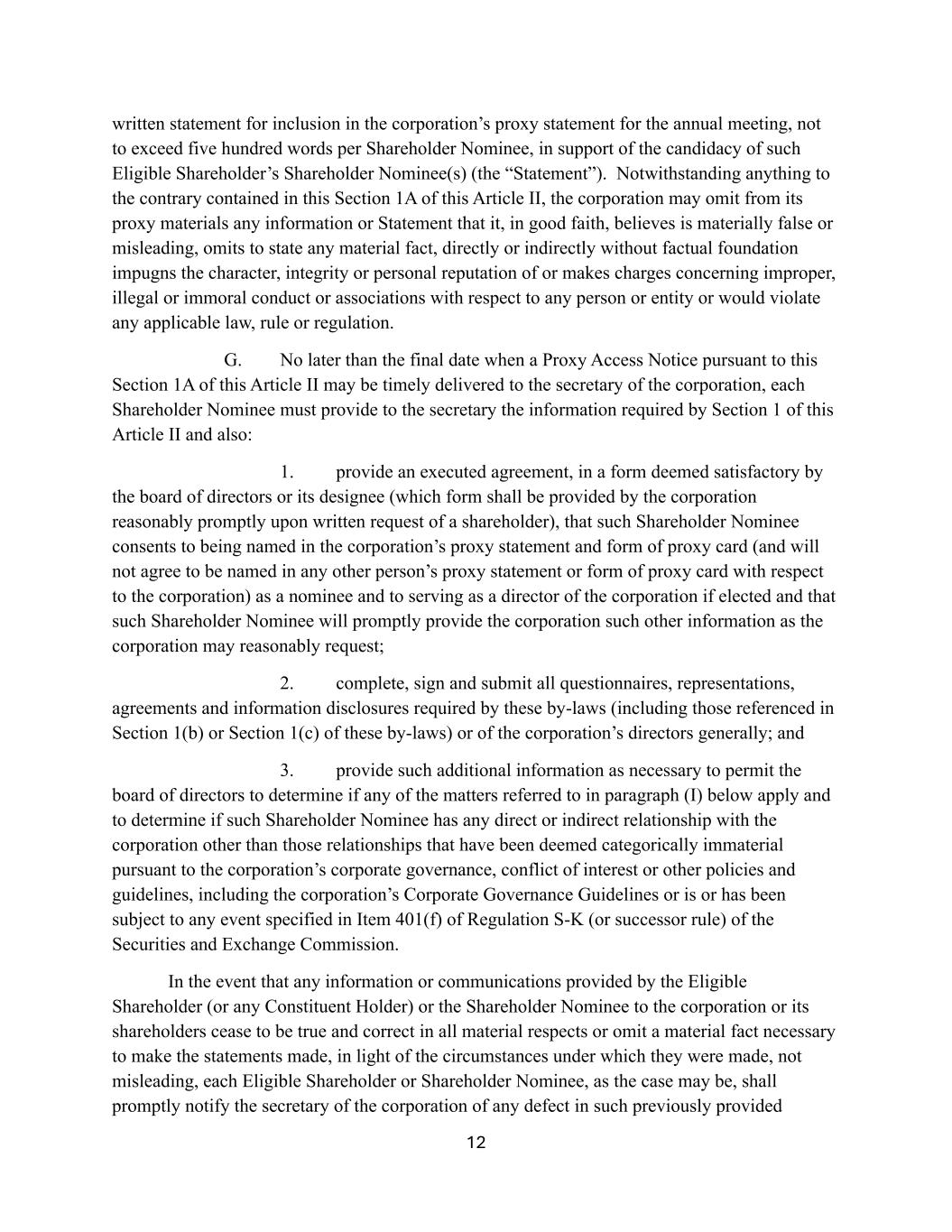 12 written statement for inclusion in the corporation’s proxy statement for the annual meeting, not to exceed five hundred words per Shareholder Nominee, in support of the candidacy of such Eligible Shareholder’s Shareholder Nominee(s) (the “Statement”). Notwithstanding anything to the contrary contained in this Section 1A of this Article II, the corporation may omit from its proxy materials any information or Statement that it, in good faith, believes is materially false or misleading, omits to state any material fact, directly or indirectly without factual foundation impugns the character, integrity or personal reputation of or makes charges concerning improper, illegal or immoral conduct or associations with respect to any person or entity or would violate any applicable law, rule or regulation. G. No later than the final date when a Proxy Access Notice pursuant to this Section 1A of this Article II may be timely delivered to the secretary of the corporation, each Shareholder Nominee must provide to the secretary the information required by Section 1 of this Article II and also: 1. provide an executed agreement, in a form deemed satisfactory by the board of directors or its designee (which form shall be provided by the corporation reasonably promptly upon written request of a shareholder), that such Shareholder Nominee consents to being named in the corporation’s proxy statement and form of proxy card (and will not agree to be named in any other person’s proxy statement or form of proxy card with respect to the corporation) as a nominee and to serving as a director of the corporation if elected and that such Shareholder Nominee will promptly provide the corporation such other information as the corporation may reasonably request; 2. complete, sign and submit all questionnaires, representations, agreements and information disclosures required by these by-laws (including those referenced in Section 1(b) or Section 1(c) of these by-laws) or of the corporation’s directors generally; and 3. provide such additional information as necessary to permit the board of directors to determine if any of the matters referred to in paragraph (I) below apply and to determine if such Shareholder Nominee has any direct or indirect relationship with the corporation other than those relationships that have been deemed categorically immaterial pursuant to the corporation’s corporate governance, conflict of interest or other policies and guidelines, including the corporation’s Corporate Governance Guidelines or is or has been subject to any event specified in Item 401(f) of Regulation S-K (or successor rule) of the Securities and Exchange Commission. In the event that any information or communications provided by the Eligible Shareholder (or any Constituent Holder) or the Shareholder Nominee to the corporation or its shareholders cease to be true and correct in all material respects or omit a material fact necessary to make the statements made, in light of the circumstances under which they were made, not misleading, each Eligible Shareholder or Shareholder Nominee, as the case may be, shall promptly notify the secretary of the corporation of any defect in such previously provided