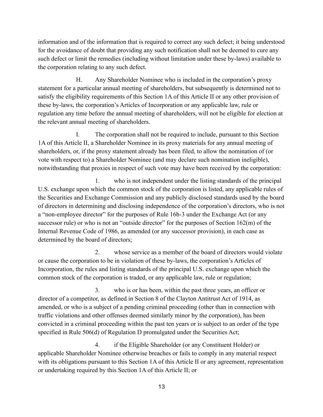 13 information and of the information that is required to correct any such defect; it being understood for the avoidance of doubt that providing any such notification shall not be deemed to cure any such defect or limit the remedies (including without limitation under these by-laws) available to the corporation relating to any such defect. H. Any Shareholder Nominee who is included in the corporation’s proxy statement for a particular annual meeting of shareholders, but subsequently is determined not to satisfy the eligibility requirements of this Section 1A of this Article II or any other provision of these by-laws, the corporation’s Articles of Incorporation or any applicable law, rule or regulation any time before the annual meeting of shareholders, will not be eligible for election at the relevant annual meeting of shareholders. I. The corporation shall not be required to include, pursuant to this Section 1A of this Article II, a Shareholder Nominee in its proxy materials for any annual meeting of shareholders, or, if the proxy statement already has been filed, to allow the nomination of (or vote with respect to) a Shareholder Nominee (and may declare such nomination ineligible), notwithstanding that proxies in respect of such vote may have been received by the corporation: 1. who is not independent under the listing standards of the principal U.S. exchange upon which the common stock of the corporation is listed, any applicable rules of the Securities and Exchange Commission and any publicly disclosed standards used by the board of directors in determining and disclosing independence of the corporation’s directors, who is not a “non-employee director” for the purposes of Rule 16b-3 under the Exchange Act (or any successor rule) or who is not an “outside director” for the purposes of Section 162(m) of the Internal Revenue Code of 1986, as amended (or any successor provision), in each case as determined by the board of directors; 2. whose service as a member of the board of directors would violate or cause the corporation to be in violation of these by-laws, the corporation’s Articles of Incorporation, the rules and listing standards of the principal U.S. exchange upon which the common stock of the corporation is traded, or any applicable law, rule or regulation; 3. who is or has been, within the past three years, an officer or director of a competitor, as defined in Section 8 of the Clayton Antitrust Act of 1914, as amended, or who is a subject of a pending criminal proceeding (other than in connection with traffic violations and other offenses deemed similarly minor by the corporation), has been convicted in a criminal proceeding within the past ten years or is subject to an order of the type specified in Rule 506(d) of Regulation D promulgated under the Securities Act; 4. if the Eligible Shareholder (or any Constituent Holder) or applicable Shareholder Nominee otherwise breaches or fails to comply in any material respect with its obligations pursuant to this Section 1A of this Article II or any agreement, representation or undertaking required by this Section 1A of this Article II; or