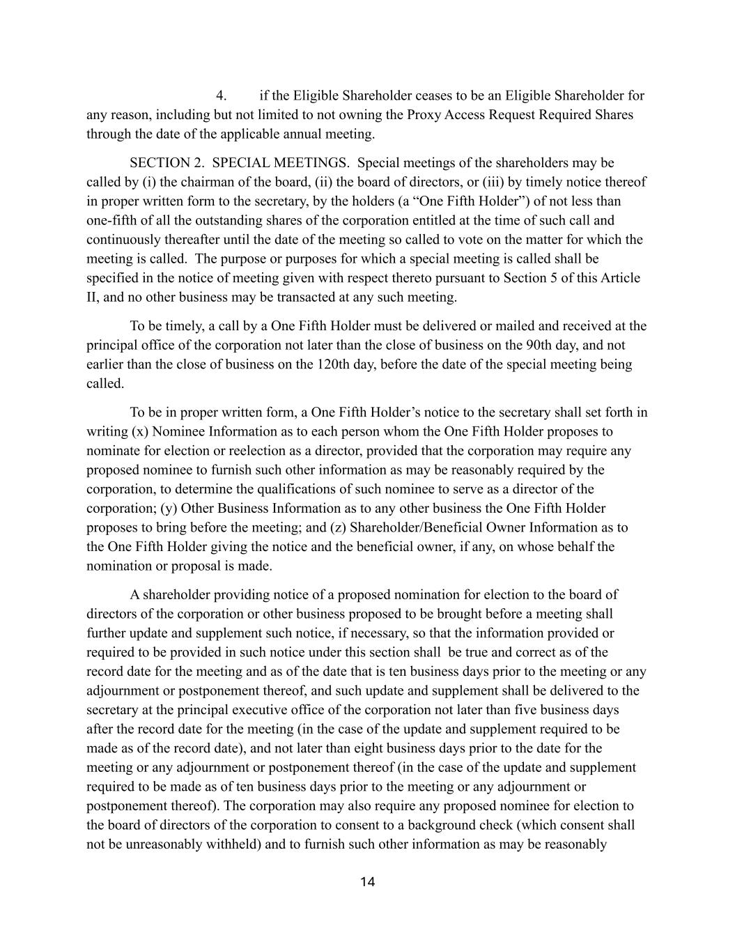 14 4. if the Eligible Shareholder ceases to be an Eligible Shareholder for any reason, including but not limited to not owning the Proxy Access Request Required Shares through the date of the applicable annual meeting. SECTION 2. SPECIAL MEETINGS. Special meetings of the shareholders may be called by (i) the chairman of the board, (ii) the board of directors, or (iii) by timely notice thereof in proper written form to the secretary, by the holders (a “One Fifth Holder”) of not less than one-fifth of all the outstanding shares of the corporation entitled at the time of such call and continuously thereafter until the date of the meeting so called to vote on the matter for which the meeting is called. The purpose or purposes for which a special meeting is called shall be specified in the notice of meeting given with respect thereto pursuant to Section 5 of this Article II, and no other business may be transacted at any such meeting. To be timely, a call by a One Fifth Holder must be delivered or mailed and received at the principal office of the corporation not later than the close of business on the 90th day, and not earlier than the close of business on the 120th day, before the date of the special meeting being called. To be in proper written form, a One Fifth Holder’s notice to the secretary shall set forth in writing (x) Nominee Information as to each person whom the One Fifth Holder proposes to nominate for election or reelection as a director, provided that the corporation may require any proposed nominee to furnish such other information as may be reasonably required by the corporation, to determine the qualifications of such nominee to serve as a director of the corporation; (y) Other Business Information as to any other business the One Fifth Holder proposes to bring before the meeting; and (z) Shareholder/Beneficial Owner Information as to the One Fifth Holder giving the notice and the beneficial owner, if any, on whose behalf the nomination or proposal is made. A shareholder providing notice of a proposed nomination for election to the board of directors of the corporation or other business proposed to be brought before a meeting shall further update and supplement such notice, if necessary, so that the information provided or required to be provided in such notice under this section shall be true and correct as of the record date for the meeting and as of the date that is ten business days prior to the meeting or any adjournment or postponement thereof, and such update and supplement shall be delivered to the secretary at the principal executive office of the corporation not later than five business days after the record date for the meeting (in the case of the update and supplement required to be made as of the record date), and not later than eight business days prior to the date for the meeting or any adjournment or postponement thereof (in the case of the update and supplement required to be made as of ten business days prior to the meeting or any adjournment or postponement thereof). The corporation may also require any proposed nominee for election to the board of directors of the corporation to consent to a background check (which consent shall not be unreasonably withheld) and to furnish such other information as may be reasonably