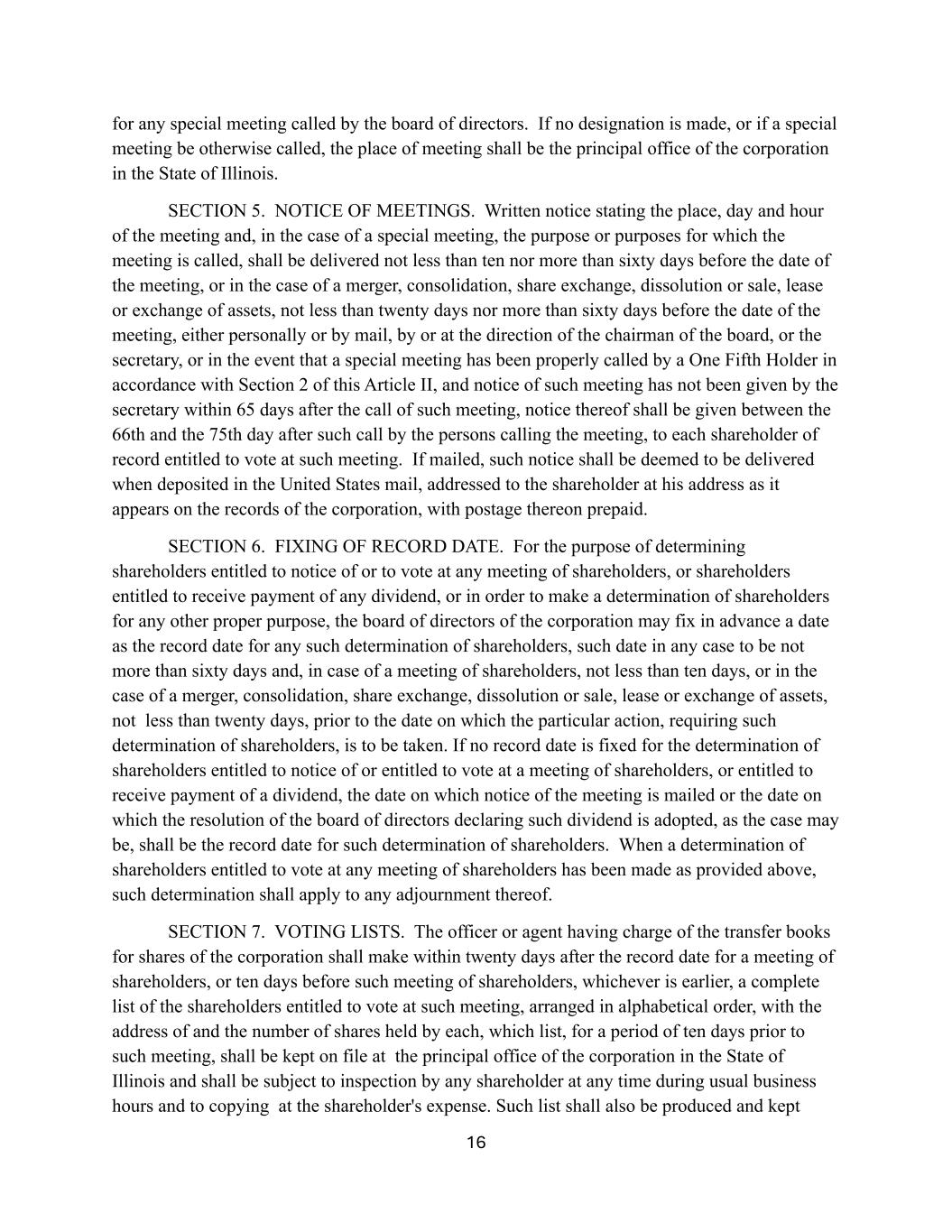 16 for any special meeting called by the board of directors. If no designation is made, or if a special meeting be otherwise called, the place of meeting shall be the principal office of the corporation in the State of Illinois. SECTION 5. NOTICE OF MEETINGS. Written notice stating the place, day and hour of the meeting and, in the case of a special meeting, the purpose or purposes for which the meeting is called, shall be delivered not less than ten nor more than sixty days before the date of the meeting, or in the case of a merger, consolidation, share exchange, dissolution or sale, lease or exchange of assets, not less than twenty days nor more than sixty days before the date of the meeting, either personally or by mail, by or at the direction of the chairman of the board, or the secretary, or in the event that a special meeting has been properly called by a One Fifth Holder in accordance with Section 2 of this Article II, and notice of such meeting has not been given by the secretary within 65 days after the call of such meeting, notice thereof shall be given between the 66th and the 75th day after such call by the persons calling the meeting, to each shareholder of record entitled to vote at such meeting. If mailed, such notice shall be deemed to be delivered when deposited in the United States mail, addressed to the shareholder at his address as it appears on the records of the corporation, with postage thereon prepaid. SECTION 6. FIXING OF RECORD DATE. For the purpose of determining shareholders entitled to notice of or to vote at any meeting of shareholders, or shareholders entitled to receive payment of any dividend, or in order to make a determination of shareholders for any other proper purpose, the board of directors of the corporation may fix in advance a date as the record date for any such determination of shareholders, such date in any case to be not more than sixty days and, in case of a meeting of shareholders, not less than ten days, or in the case of a merger, consolidation, share exchange, dissolution or sale, lease or exchange of assets, not less than twenty days, prior to the date on which the particular action, requiring such determination of shareholders, is to be taken. If no record date is fixed for the determination of shareholders entitled to notice of or entitled to vote at a meeting of shareholders, or entitled to receive payment of a dividend, the date on which notice of the meeting is mailed or the date on which the resolution of the board of directors declaring such dividend is adopted, as the case may be, shall be the record date for such determination of shareholders. When a determination of shareholders entitled to vote at any meeting of shareholders has been made as provided above, such determination shall apply to any adjournment thereof. SECTION 7. VOTING LISTS. The officer or agent having charge of the transfer books for shares of the corporation shall make within twenty days after the record date for a meeting of shareholders, or ten days before such meeting of shareholders, whichever is earlier, a complete list of the shareholders entitled to vote at such meeting, arranged in alphabetical order, with the address of and the number of shares held by each, which list, for a period of ten days prior to such meeting, shall be kept on file at the principal office of the corporation in the State of Illinois and shall be subject to inspection by any shareholder at any time during usual business hours and to copying at the shareholder's expense. Such list shall also be produced and kept