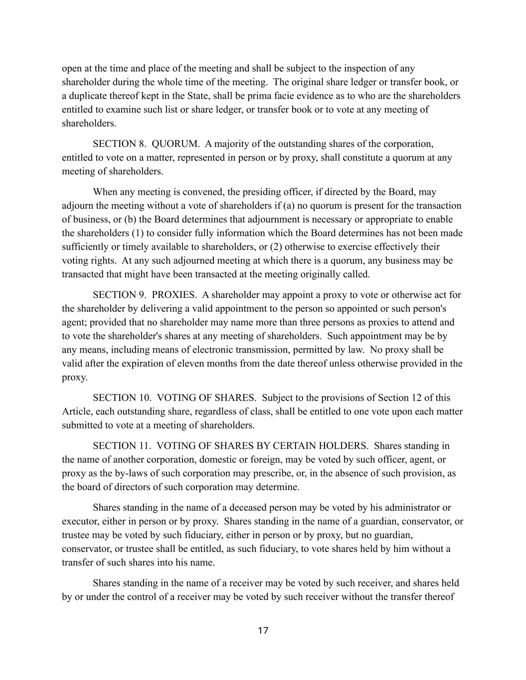 17 open at the time and place of the meeting and shall be subject to the inspection of any shareholder during the whole time of the meeting. The original share ledger or transfer book, or a duplicate thereof kept in the State, shall be prima facie evidence as to who are the shareholders entitled to examine such list or share ledger, or transfer book or to vote at any meeting of shareholders. SECTION 8. QUORUM. A majority of the outstanding shares of the corporation, entitled to vote on a matter, represented in person or by proxy, shall constitute a quorum at any meeting of shareholders. When any meeting is convened, the presiding officer, if directed by the Board, may adjourn the meeting without a vote of shareholders if (a) no quorum is present for the transaction of business, or (b) the Board determines that adjournment is necessary or appropriate to enable the shareholders (1) to consider fully information which the Board determines has not been made sufficiently or timely available to shareholders, or (2) otherwise to exercise effectively their voting rights. At any such adjourned meeting at which there is a quorum, any business may be transacted that might have been transacted at the meeting originally called. SECTION 9. PROXIES. A shareholder may appoint a proxy to vote or otherwise act for the shareholder by delivering a valid appointment to the person so appointed or such person's agent; provided that no shareholder may name more than three persons as proxies to attend and to vote the shareholder's shares at any meeting of shareholders. Such appointment may be by any means, including means of electronic transmission, permitted by law. No proxy shall be valid after the expiration of eleven months from the date thereof unless otherwise provided in the proxy. SECTION 10. VOTING OF SHARES. Subject to the provisions of Section 12 of this Article, each outstanding share, regardless of class, shall be entitled to one vote upon each matter submitted to vote at a meeting of shareholders. SECTION 11. VOTING OF SHARES BY CERTAIN HOLDERS. Shares standing in the name of another corporation, domestic or foreign, may be voted by such officer, agent, or proxy as the by-laws of such corporation may prescribe, or, in the absence of such provision, as the board of directors of such corporation may determine. Shares standing in the name of a deceased person may be voted by his administrator or executor, either in person or by proxy. Shares standing in the name of a guardian, conservator, or trustee may be voted by such fiduciary, either in person or by proxy, but no guardian, conservator, or trustee shall be entitled, as such fiduciary, to vote shares held by him without a transfer of such shares into his name. Shares standing in the name of a receiver may be voted by such receiver, and shares held by or under the control of a receiver may be voted by such receiver without the transfer thereof