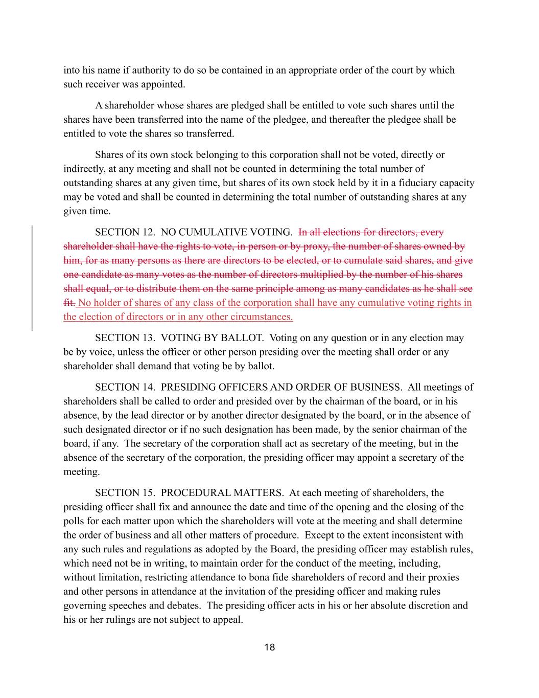 18 into his name if authority to do so be contained in an appropriate order of the court by which such receiver was appointed. A shareholder whose shares are pledged shall be entitled to vote such shares until the shares have been transferred into the name of the pledgee, and thereafter the pledgee shall be entitled to vote the shares so transferred. Shares of its own stock belonging to this corporation shall not be voted, directly or indirectly, at any meeting and shall not be counted in determining the total number of outstanding shares at any given time, but shares of its own stock held by it in a fiduciary capacity may be voted and shall be counted in determining the total number of outstanding shares at any given time. SECTION 12. NO CUMULATIVE VOTING. In all elections for directors, every shareholder shall have the rights to vote, in person or by proxy, the number of shares owned by him, for as many persons as there are directors to be elected, or to cumulate said shares, and give one candidate as many votes as the number of directors multiplied by the number of his shares shall equal, or to distribute them on the same principle among as many candidates as he shall see fit. No holder of shares of any class of the corporation shall have any cumulative voting rights in the election of directors or in any other circumstances. SECTION 13. VOTING BY BALLOT. Voting on any question or in any election may be by voice, unless the officer or other person presiding over the meeting shall order or any shareholder shall demand that voting be by ballot. SECTION 14. PRESIDING OFFICERS AND ORDER OF BUSINESS. All meetings of shareholders shall be called to order and presided over by the chairman of the board, or in his absence, by the lead director or by another director designated by the board, or in the absence of such designated director or if no such designation has been made, by the senior chairman of the board, if any. The secretary of the corporation shall act as secretary of the meeting, but in the absence of the secretary of the corporation, the presiding officer may appoint a secretary of the meeting. SECTION 15. PROCEDURAL MATTERS. At each meeting of shareholders, the presiding officer shall fix and announce the date and time of the opening and the closing of the polls for each matter upon which the shareholders will vote at the meeting and shall determine the order of business and all other matters of procedure. Except to the extent inconsistent with any such rules and regulations as adopted by the Board, the presiding officer may establish rules, which need not be in writing, to maintain order for the conduct of the meeting, including, without limitation, restricting attendance to bona fide shareholders of record and their proxies and other persons in attendance at the invitation of the presiding officer and making rules governing speeches and debates. The presiding officer acts in his or her absolute discretion and his or her rulings are not subject to appeal.