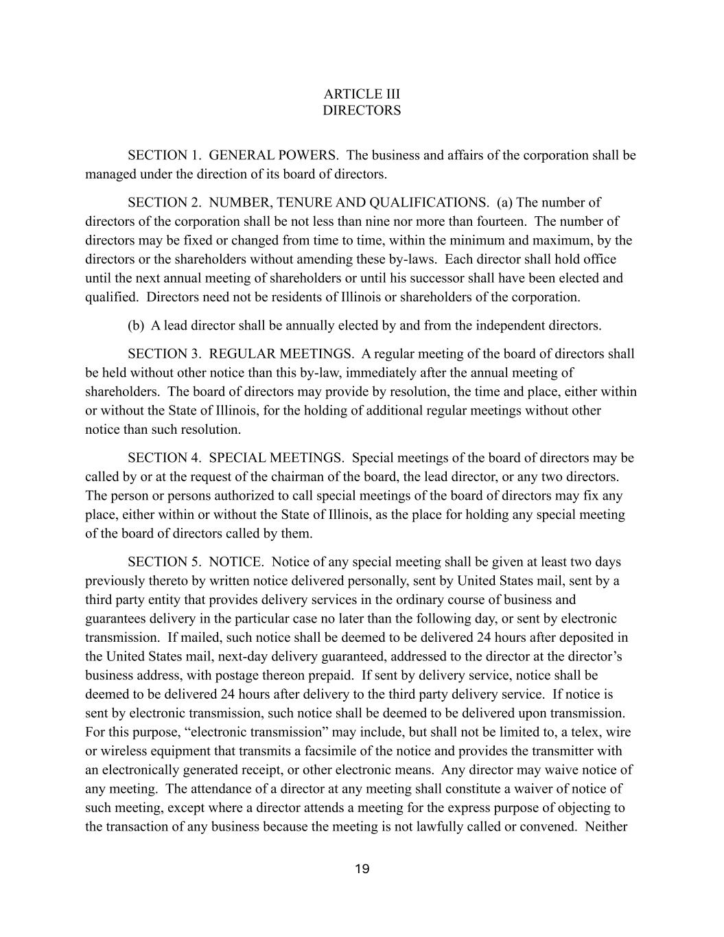 19 ARTICLE III DIRECTORS SECTION 1. GENERAL POWERS. The business and affairs of the corporation shall be managed under the direction of its board of directors. SECTION 2. NUMBER, TENURE AND QUALIFICATIONS. (a) The number of directors of the corporation shall be not less than nine nor more than fourteen. The number of directors may be fixed or changed from time to time, within the minimum and maximum, by the directors or the shareholders without amending these by-laws. Each director shall hold office until the next annual meeting of shareholders or until his successor shall have been elected and qualified. Directors need not be residents of Illinois or shareholders of the corporation. (b) A lead director shall be annually elected by and from the independent directors. SECTION 3. REGULAR MEETINGS. A regular meeting of the board of directors shall be held without other notice than this by-law, immediately after the annual meeting of shareholders. The board of directors may provide by resolution, the time and place, either within or without the State of Illinois, for the holding of additional regular meetings without other notice than such resolution. SECTION 4. SPECIAL MEETINGS. Special meetings of the board of directors may be called by or at the request of the chairman of the board, the lead director, or any two directors. The person or persons authorized to call special meetings of the board of directors may fix any place, either within or without the State of Illinois, as the place for holding any special meeting of the board of directors called by them. SECTION 5. NOTICE. Notice of any special meeting shall be given at least two days previously thereto by written notice delivered personally, sent by United States mail, sent by a third party entity that provides delivery services in the ordinary course of business and guarantees delivery in the particular case no later than the following day, or sent by electronic transmission. If mailed, such notice shall be deemed to be delivered 24 hours after deposited in the United States mail, next-day delivery guaranteed, addressed to the director at the director’s business address, with postage thereon prepaid. If sent by delivery service, notice shall be deemed to be delivered 24 hours after delivery to the third party delivery service. If notice is sent by electronic transmission, such notice shall be deemed to be delivered upon transmission. For this purpose, “electronic transmission” may include, but shall not be limited to, a telex, wire or wireless equipment that transmits a facsimile of the notice and provides the transmitter with an electronically generated receipt, or other electronic means. Any director may waive notice of any meeting. The attendance of a director at any meeting shall constitute a waiver of notice of such meeting, except where a director attends a meeting for the express purpose of objecting to the transaction of any business because the meeting is not lawfully called or convened. Neither