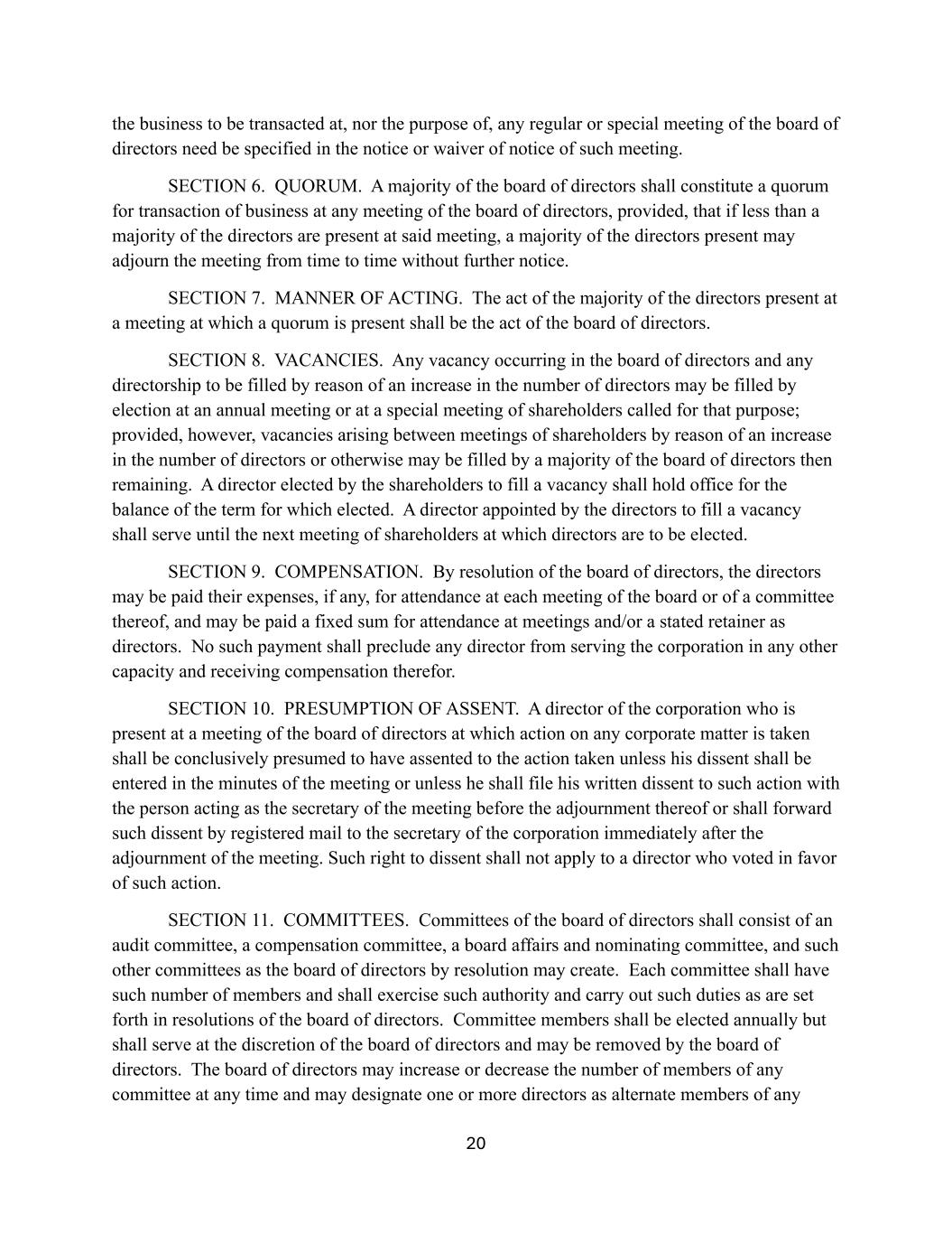 20 the business to be transacted at, nor the purpose of, any regular or special meeting of the board of directors need be specified in the notice or waiver of notice of such meeting. SECTION 6. QUORUM. A majority of the board of directors shall constitute a quorum for transaction of business at any meeting of the board of directors, provided, that if less than a majority of the directors are present at said meeting, a majority of the directors present may adjourn the meeting from time to time without further notice. SECTION 7. MANNER OF ACTING. The act of the majority of the directors present at a meeting at which a quorum is present shall be the act of the board of directors. SECTION 8. VACANCIES. Any vacancy occurring in the board of directors and any directorship to be filled by reason of an increase in the number of directors may be filled by election at an annual meeting or at a special meeting of shareholders called for that purpose; provided, however, vacancies arising between meetings of shareholders by reason of an increase in the number of directors or otherwise may be filled by a majority of the board of directors then remaining. A director elected by the shareholders to fill a vacancy shall hold office for the balance of the term for which elected. A director appointed by the directors to fill a vacancy shall serve until the next meeting of shareholders at which directors are to be elected. SECTION 9. COMPENSATION. By resolution of the board of directors, the directors may be paid their expenses, if any, for attendance at each meeting of the board or of a committee thereof, and may be paid a fixed sum for attendance at meetings and/or a stated retainer as directors. No such payment shall preclude any director from serving the corporation in any other capacity and receiving compensation therefor. SECTION 10. PRESUMPTION OF ASSENT. A director of the corporation who is present at a meeting of the board of directors at which action on any corporate matter is taken shall be conclusively presumed to have assented to the action taken unless his dissent shall be entered in the minutes of the meeting or unless he shall file his written dissent to such action with the person acting as the secretary of the meeting before the adjournment thereof or shall forward such dissent by registered mail to the secretary of the corporation immediately after the adjournment of the meeting. Such right to dissent shall not apply to a director who voted in favor of such action. SECTION 11. COMMITTEES. Committees of the board of directors shall consist of an audit committee, a compensation committee, a board affairs and nominating committee, and such other committees as the board of directors by resolution may create. Each committee shall have such number of members and shall exercise such authority and carry out such duties as are set forth in resolutions of the board of directors. Committee members shall be elected annually but shall serve at the discretion of the board of directors and may be removed by the board of directors. The board of directors may increase or decrease the number of members of any committee at any time and may designate one or more directors as alternate members of any