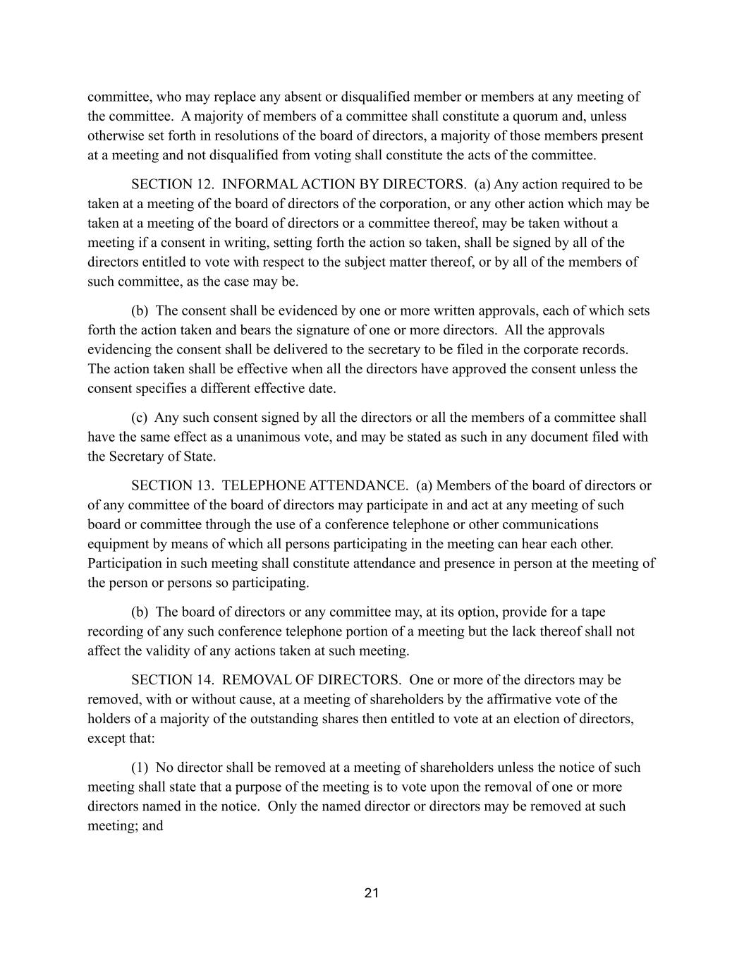 21 committee, who may replace any absent or disqualified member or members at any meeting of the committee. A majority of members of a committee shall constitute a quorum and, unless otherwise set forth in resolutions of the board of directors, a majority of those members present at a meeting and not disqualified from voting shall constitute the acts of the committee. SECTION 12. INFORMAL ACTION BY DIRECTORS. (a) Any action required to be taken at a meeting of the board of directors of the corporation, or any other action which may be taken at a meeting of the board of directors or a committee thereof, may be taken without a meeting if a consent in writing, setting forth the action so taken, shall be signed by all of the directors entitled to vote with respect to the subject matter thereof, or by all of the members of such committee, as the case may be. (b) The consent shall be evidenced by one or more written approvals, each of which sets forth the action taken and bears the signature of one or more directors. All the approvals evidencing the consent shall be delivered to the secretary to be filed in the corporate records. The action taken shall be effective when all the directors have approved the consent unless the consent specifies a different effective date. (c) Any such consent signed by all the directors or all the members of a committee shall have the same effect as a unanimous vote, and may be stated as such in any document filed with the Secretary of State. SECTION 13. TELEPHONE ATTENDANCE. (a) Members of the board of directors or of any committee of the board of directors may participate in and act at any meeting of such board or committee through the use of a conference telephone or other communications equipment by means of which all persons participating in the meeting can hear each other. Participation in such meeting shall constitute attendance and presence in person at the meeting of the person or persons so participating. (b) The board of directors or any committee may, at its option, provide for a tape recording of any such conference telephone portion of a meeting but the lack thereof shall not affect the validity of any actions taken at such meeting. SECTION 14. REMOVAL OF DIRECTORS. One or more of the directors may be removed, with or without cause, at a meeting of shareholders by the affirmative vote of the holders of a majority of the outstanding shares then entitled to vote at an election of directors, except that: (1) No director shall be removed at a meeting of shareholders unless the notice of such meeting shall state that a purpose of the meeting is to vote upon the removal of one or more directors named in the notice. Only the named director or directors may be removed at such meeting; and