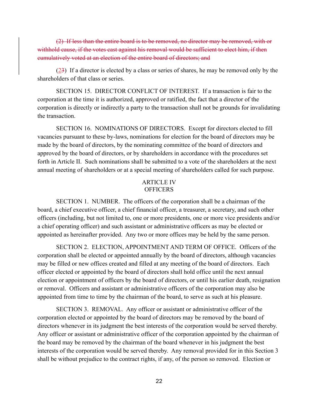 22 (2) If less than the entire board is to be removed, no director may be removed, with or withhold cause, if the votes cast against his removal would be sufficient to elect him, if then cumulatively voted at an election of the entire board of directors; and (23) If a director is elected by a class or series of shares, he may be removed only by the shareholders of that class or series. SECTION 15. DIRECTOR CONFLICT OF INTEREST. If a transaction is fair to the corporation at the time it is authorized, approved or ratified, the fact that a director of the corporation is directly or indirectly a party to the transaction shall not be grounds for invalidating the transaction. SECTION 16. NOMINATIONS OF DIRECTORS. Except for directors elected to fill vacancies pursuant to these by-laws, nominations for election for the board of directors may be made by the board of directors, by the nominating committee of the board of directors and approved by the board of directors, or by shareholders in accordance with the procedures set forth in Article II. Such nominations shall be submitted to a vote of the shareholders at the next annual meeting of shareholders or at a special meeting of shareholders called for such purpose. ARTICLE IV OFFICERS SECTION 1. NUMBER. The officers of the corporation shall be a chairman of the board, a chief executive officer, a chief financial officer, a treasurer, a secretary, and such other officers (including, but not limited to, one or more presidents, one or more vice presidents and/or a chief operating officer) and such assistant or administrative officers as may be elected or appointed as hereinafter provided. Any two or more offices may be held by the same person. SECTION 2. ELECTION, APPOINTMENT AND TERM OF OFFICE. Officers of the corporation shall be elected or appointed annually by the board of directors, although vacancies may be filled or new offices created and filled at any meeting of the board of directors. Each officer elected or appointed by the board of directors shall hold office until the next annual election or appointment of officers by the board of directors, or until his earlier death, resignation or removal. Officers and assistant or administrative officers of the corporation may also be appointed from time to time by the chairman of the board, to serve as such at his pleasure. SECTION 3. REMOVAL. Any officer or assistant or administrative officer of the corporation elected or appointed by the board of directors may be removed by the board of directors whenever in its judgment the best interests of the corporation would be served thereby. Any officer or assistant or administrative officer of the corporation appointed by the chairman of the board may be removed by the chairman of the board whenever in his judgment the best interests of the corporation would be served thereby. Any removal provided for in this Section 3 shall be without prejudice to the contract rights, if any, of the person so removed. Election or