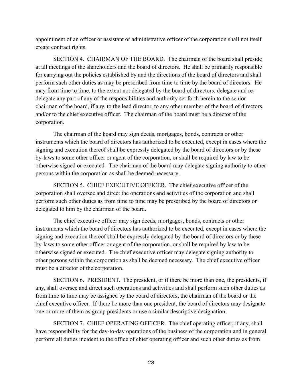 23 appointment of an officer or assistant or administrative officer of the corporation shall not itself create contract rights. SECTION 4. CHAIRMAN OF THE BOARD. The chairman of the board shall preside at all meetings of the shareholders and the board of directors. He shall be primarily responsible for carrying out the policies established by and the directions of the board of directors and shall perform such other duties as may be prescribed from time to time by the board of directors. He may from time to time, to the extent not delegated by the board of directors, delegate and re- delegate any part of any of the responsibilities and authority set forth herein to the senior chairman of the board, if any, to the lead director, to any other member of the board of directors, and/or to the chief executive officer. The chairman of the board must be a director of the corporation. The chairman of the board may sign deeds, mortgages, bonds, contracts or other instruments which the board of directors has authorized to be executed, except in cases where the signing and execution thereof shall be expressly delegated by the board of directors or by these by-laws to some other officer or agent of the corporation, or shall be required by law to be otherwise signed or executed. The chairman of the board may delegate signing authority to other persons within the corporation as shall be deemed necessary. SECTION 5. CHIEF EXECUTIVE OFFICER. The chief executive officer of the corporation shall oversee and direct the operations and activities of the corporation and shall perform such other duties as from time to time may be prescribed by the board of directors or delegated to him by the chairman of the board. The chief executive officer may sign deeds, mortgages, bonds, contracts or other instruments which the board of directors has authorized to be executed, except in cases where the signing and execution thereof shall be expressly delegated by the board of directors or by these by-laws to some other officer or agent of the corporation, or shall be required by law to be otherwise signed or executed. The chief executive officer may delegate signing authority to other persons within the corporation as shall be deemed necessary. The chief executive officer must be a director of the corporation. SECTION 6. PRESIDENT. The president, or if there be more than one, the presidents, if any, shall oversee and direct such operations and activities and shall perform such other duties as from time to time may be assigned by the board of directors, the chairman of the board or the chief executive officer. If there be more than one president, the board of directors may designate one or more of them as group presidents or use a similar descriptive designation. SECTION 7. CHIEF OPERATING OFFICER. The chief operating officer, if any, shall have responsibility for the day-to-day operations of the business of the corporation and in general perform all duties incident to the office of chief operating officer and such other duties as from