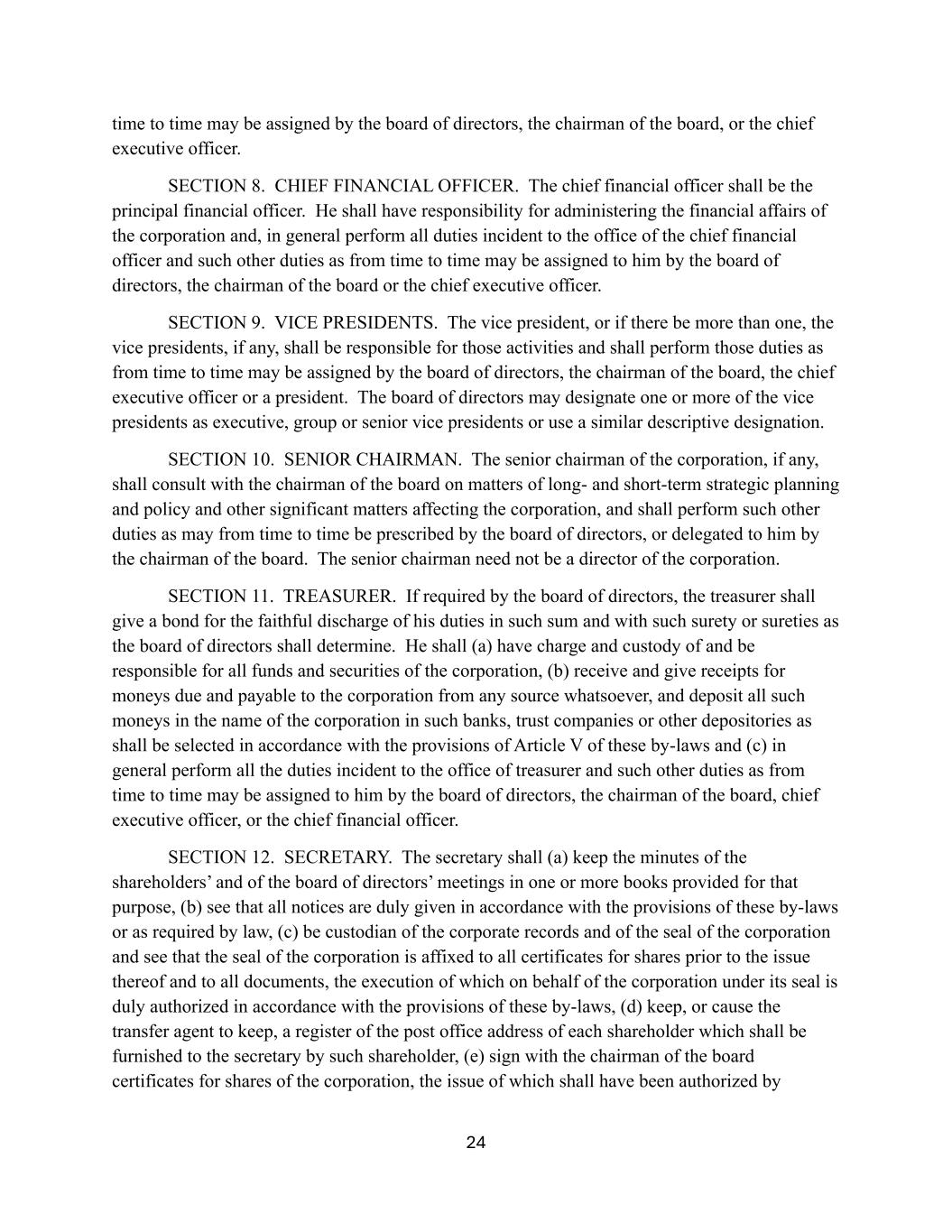24 time to time may be assigned by the board of directors, the chairman of the board, or the chief executive officer. SECTION 8. CHIEF FINANCIAL OFFICER. The chief financial officer shall be the principal financial officer. He shall have responsibility for administering the financial affairs of the corporation and, in general perform all duties incident to the office of the chief financial officer and such other duties as from time to time may be assigned to him by the board of directors, the chairman of the board or the chief executive officer. SECTION 9. VICE PRESIDENTS. The vice president, or if there be more than one, the vice presidents, if any, shall be responsible for those activities and shall perform those duties as from time to time may be assigned by the board of directors, the chairman of the board, the chief executive officer or a president. The board of directors may designate one or more of the vice presidents as executive, group or senior vice presidents or use a similar descriptive designation. SECTION 10. SENIOR CHAIRMAN. The senior chairman of the corporation, if any, shall consult with the chairman of the board on matters of long- and short-term strategic planning and policy and other significant matters affecting the corporation, and shall perform such other duties as may from time to time be prescribed by the board of directors, or delegated to him by the chairman of the board. The senior chairman need not be a director of the corporation. SECTION 11. TREASURER. If required by the board of directors, the treasurer shall give a bond for the faithful discharge of his duties in such sum and with such surety or sureties as the board of directors shall determine. He shall (a) have charge and custody of and be responsible for all funds and securities of the corporation, (b) receive and give receipts for moneys due and payable to the corporation from any source whatsoever, and deposit all such moneys in the name of the corporation in such banks, trust companies or other depositories as shall be selected in accordance with the provisions of Article V of these by-laws and (c) in general perform all the duties incident to the office of treasurer and such other duties as from time to time may be assigned to him by the board of directors, the chairman of the board, chief executive officer, or the chief financial officer. SECTION 12. SECRETARY. The secretary shall (a) keep the minutes of the shareholders’ and of the board of directors’ meetings in one or more books provided for that purpose, (b) see that all notices are duly given in accordance with the provisions of these by-laws or as required by law, (c) be custodian of the corporate records and of the seal of the corporation and see that the seal of the corporation is affixed to all certificates for shares prior to the issue thereof and to all documents, the execution of which on behalf of the corporation under its seal is duly authorized in accordance with the provisions of these by-laws, (d) keep, or cause the transfer agent to keep, a register of the post office address of each shareholder which shall be furnished to the secretary by such shareholder, (e) sign with the chairman of the board certificates for shares of the corporation, the issue of which shall have been authorized by