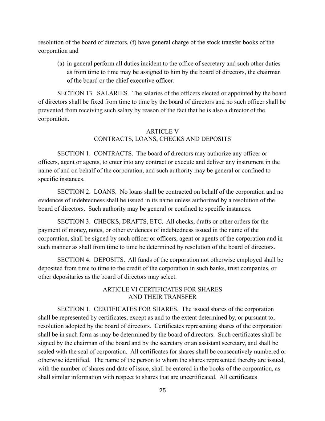 25 resolution of the board of directors, (f) have general charge of the stock transfer books of the corporation and (a) in general perform all duties incident to the office of secretary and such other duties as from time to time may be assigned to him by the board of directors, the chairman of the board or the chief executive officer. SECTION 13. SALARIES. The salaries of the officers elected or appointed by the board of directors shall be fixed from time to time by the board of directors and no such officer shall be prevented from receiving such salary by reason of the fact that he is also a director of the corporation. ARTICLE V CONTRACTS, LOANS, CHECKS AND DEPOSITS SECTION 1. CONTRACTS. The board of directors may authorize any officer or officers, agent or agents, to enter into any contract or execute and deliver any instrument in the name of and on behalf of the corporation, and such authority may be general or confined to specific instances. SECTION 2. LOANS. No loans shall be contracted on behalf of the corporation and no evidences of indebtedness shall be issued in its name unless authorized by a resolution of the board of directors. Such authority may be general or confined to specific instances. SECTION 3. CHECKS, DRAFTS, ETC. All checks, drafts or other orders for the payment of money, notes, or other evidences of indebtedness issued in the name of the corporation, shall be signed by such officer or officers, agent or agents of the corporation and in such manner as shall from time to time be determined by resolution of the board of directors. SECTION 4. DEPOSITS. All funds of the corporation not otherwise employed shall be deposited from time to time to the credit of the corporation in such banks, trust companies, or other depositaries as the board of directors may select. ARTICLE VI CERTIFICATES FOR SHARES AND THEIR TRANSFER SECTION 1. CERTIFICATES FOR SHARES. The issued shares of the corporation shall be represented by certificates, except as and to the extent determined by, or pursuant to, resolution adopted by the board of directors. Certificates representing shares of the corporation shall be in such form as may be determined by the board of directors. Such certificates shall be signed by the chairman of the board and by the secretary or an assistant secretary, and shall be sealed with the seal of corporation. All certificates for shares shall be consecutively numbered or otherwise identified. The name of the person to whom the shares represented thereby are issued, with the number of shares and date of issue, shall be entered in the books of the corporation, as shall similar information with respect to shares that are uncertificated. All certificates