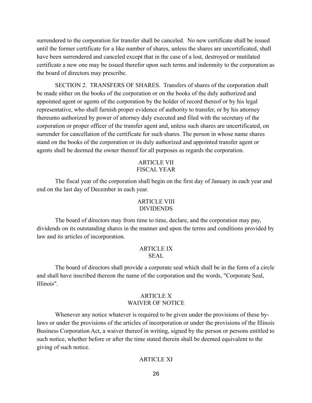26 surrendered to the corporation for transfer shall be canceled. No new certificate shall be issued until the former certificate for a like number of shares, unless the shares are uncertificated, shall have been surrendered and canceled except that in the case of a lost, destroyed or mutilated certificate a new one may be issued therefor upon such terms and indemnity to the corporation as the board of directors may prescribe. SECTION 2. TRANSFERS OF SHARES. Transfers of shares of the corporation shall be made either on the books of the corporation or on the books of the duly authorized and appointed agent or agents of the corporation by the holder of record thereof or by his legal representative, who shall furnish proper evidence of authority to transfer, or by his attorney thereunto authorized by power of attorney duly executed and filed with the secretary of the corporation or proper officer of the transfer agent and, unless such shares are uncertificated, on surrender for cancellation of the certificate for such shares. The person in whose name shares stand on the books of the corporation or its duly authorized and appointed transfer agent or agents shall be deemed the owner thereof for all purposes as regards the corporation. ARTICLE VII FISCAL YEAR The fiscal year of the corporation shall begin on the first day of January in each year and end on the last day of December in each year. ARTICLE VIII DIVIDENDS The board of directors may from time to time, declare, and the corporation may pay, dividends on its outstanding shares in the manner and upon the terms and conditions provided by law and its articles of incorporation. ARTICLE IX SEAL The board of directors shall provide a corporate seal which shall be in the form of a circle and shall have inscribed thereon the name of the corporation and the words, "Corporate Seal, Illinois". ARTICLE X WAIVER OF NOTICE Whenever any notice whatever is required to be given under the provisions of these by- laws or under the provisions of the articles of incorporation or under the provisions of the Illinois Business Corporation Act, a waiver thereof in writing, signed by the person or persons entitled to such notice, whether before or after the time stated therein shall be deemed equivalent to the giving of such notice. ARTICLE XI