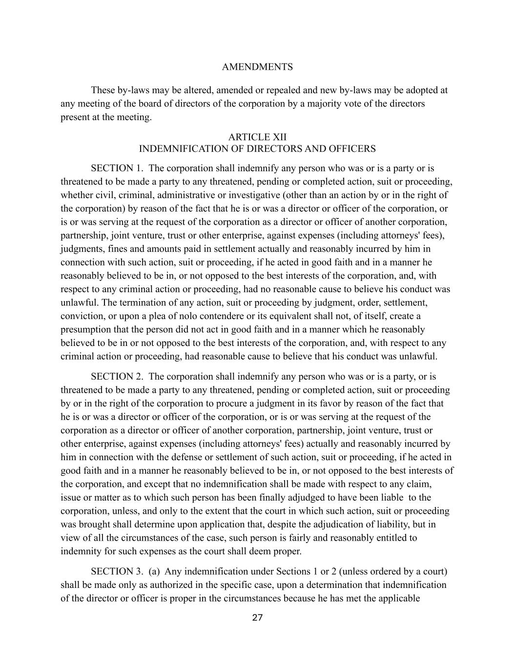 27 AMENDMENTS These by-laws may be altered, amended or repealed and new by-laws may be adopted at any meeting of the board of directors of the corporation by a majority vote of the directors present at the meeting. ARTICLE XII INDEMNIFICATION OF DIRECTORS AND OFFICERS SECTION 1. The corporation shall indemnify any person who was or is a party or is threatened to be made a party to any threatened, pending or completed action, suit or proceeding, whether civil, criminal, administrative or investigative (other than an action by or in the right of the corporation) by reason of the fact that he is or was a director or officer of the corporation, or is or was serving at the request of the corporation as a director or officer of another corporation, partnership, joint venture, trust or other enterprise, against expenses (including attorneys' fees), judgments, fines and amounts paid in settlement actually and reasonably incurred by him in connection with such action, suit or proceeding, if he acted in good faith and in a manner he reasonably believed to be in, or not opposed to the best interests of the corporation, and, with respect to any criminal action or proceeding, had no reasonable cause to believe his conduct was unlawful. The termination of any action, suit or proceeding by judgment, order, settlement, conviction, or upon a plea of nolo contendere or its equivalent shall not, of itself, create a presumption that the person did not act in good faith and in a manner which he reasonably believed to be in or not opposed to the best interests of the corporation, and, with respect to any criminal action or proceeding, had reasonable cause to believe that his conduct was unlawful. SECTION 2. The corporation shall indemnify any person who was or is a party, or is threatened to be made a party to any threatened, pending or completed action, suit or proceeding by or in the right of the corporation to procure a judgment in its favor by reason of the fact that he is or was a director or officer of the corporation, or is or was serving at the request of the corporation as a director or officer of another corporation, partnership, joint venture, trust or other enterprise, against expenses (including attorneys' fees) actually and reasonably incurred by him in connection with the defense or settlement of such action, suit or proceeding, if he acted in good faith and in a manner he reasonably believed to be in, or not opposed to the best interests of the corporation, and except that no indemnification shall be made with respect to any claim, issue or matter as to which such person has been finally adjudged to have been liable to the corporation, unless, and only to the extent that the court in which such action, suit or proceeding was brought shall determine upon application that, despite the adjudication of liability, but in view of all the circumstances of the case, such person is fairly and reasonably entitled to indemnity for such expenses as the court shall deem proper. SECTION 3. (a) Any indemnification under Sections 1 or 2 (unless ordered by a court) shall be made only as authorized in the specific case, upon a determination that indemnification of the director or officer is proper in the circumstances because he has met the applicable