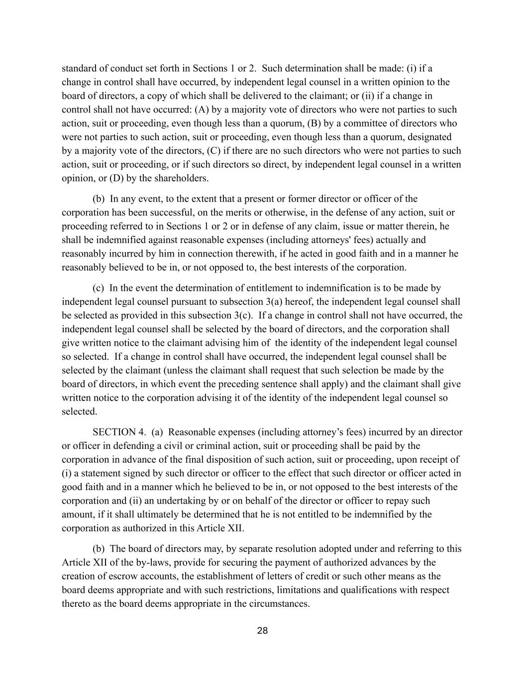 28 standard of conduct set forth in Sections 1 or 2. Such determination shall be made: (i) if a change in control shall have occurred, by independent legal counsel in a written opinion to the board of directors, a copy of which shall be delivered to the claimant; or (ii) if a change in control shall not have occurred: (A) by a majority vote of directors who were not parties to such action, suit or proceeding, even though less than a quorum, (B) by a committee of directors who were not parties to such action, suit or proceeding, even though less than a quorum, designated by a majority vote of the directors, (C) if there are no such directors who were not parties to such action, suit or proceeding, or if such directors so direct, by independent legal counsel in a written opinion, or (D) by the shareholders. (b) In any event, to the extent that a present or former director or officer of the corporation has been successful, on the merits or otherwise, in the defense of any action, suit or proceeding referred to in Sections 1 or 2 or in defense of any claim, issue or matter therein, he shall be indemnified against reasonable expenses (including attorneys' fees) actually and reasonably incurred by him in connection therewith, if he acted in good faith and in a manner he reasonably believed to be in, or not opposed to, the best interests of the corporation. (c) In the event the determination of entitlement to indemnification is to be made by independent legal counsel pursuant to subsection 3(a) hereof, the independent legal counsel shall be selected as provided in this subsection 3(c). If a change in control shall not have occurred, the independent legal counsel shall be selected by the board of directors, and the corporation shall give written notice to the claimant advising him of the identity of the independent legal counsel so selected. If a change in control shall have occurred, the independent legal counsel shall be selected by the claimant (unless the claimant shall request that such selection be made by the board of directors, in which event the preceding sentence shall apply) and the claimant shall give written notice to the corporation advising it of the identity of the independent legal counsel so selected. SECTION 4. (a) Reasonable expenses (including attorney’s fees) incurred by an director or officer in defending a civil or criminal action, suit or proceeding shall be paid by the corporation in advance of the final disposition of such action, suit or proceeding, upon receipt of (i) a statement signed by such director or officer to the effect that such director or officer acted in good faith and in a manner which he believed to be in, or not opposed to the best interests of the corporation and (ii) an undertaking by or on behalf of the director or officer to repay such amount, if it shall ultimately be determined that he is not entitled to be indemnified by the corporation as authorized in this Article XII. (b) The board of directors may, by separate resolution adopted under and referring to this Article XII of the by-laws, provide for securing the payment of authorized advances by the creation of escrow accounts, the establishment of letters of credit or such other means as the board deems appropriate and with such restrictions, limitations and qualifications with respect thereto as the board deems appropriate in the circumstances.