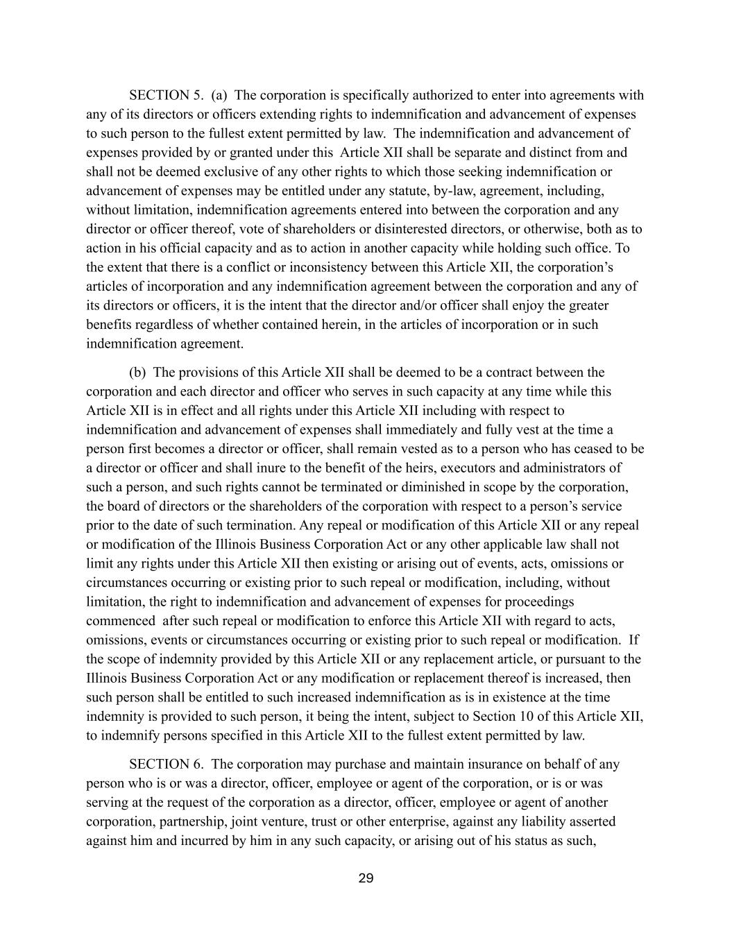 29 SECTION 5. (a) The corporation is specifically authorized to enter into agreements with any of its directors or officers extending rights to indemnification and advancement of expenses to such person to the fullest extent permitted by law. The indemnification and advancement of expenses provided by or granted under this Article XII shall be separate and distinct from and shall not be deemed exclusive of any other rights to which those seeking indemnification or advancement of expenses may be entitled under any statute, by-law, agreement, including, without limitation, indemnification agreements entered into between the corporation and any director or officer thereof, vote of shareholders or disinterested directors, or otherwise, both as to action in his official capacity and as to action in another capacity while holding such office. To the extent that there is a conflict or inconsistency between this Article XII, the corporation’s articles of incorporation and any indemnification agreement between the corporation and any of its directors or officers, it is the intent that the director and/or officer shall enjoy the greater benefits regardless of whether contained herein, in the articles of incorporation or in such indemnification agreement. (b) The provisions of this Article XII shall be deemed to be a contract between the corporation and each director and officer who serves in such capacity at any time while this Article XII is in effect and all rights under this Article XII including with respect to indemnification and advancement of expenses shall immediately and fully vest at the time a person first becomes a director or officer, shall remain vested as to a person who has ceased to be a director or officer and shall inure to the benefit of the heirs, executors and administrators of such a person, and such rights cannot be terminated or diminished in scope by the corporation, the board of directors or the shareholders of the corporation with respect to a person’s service prior to the date of such termination. Any repeal or modification of this Article XII or any repeal or modification of the Illinois Business Corporation Act or any other applicable law shall not limit any rights under this Article XII then existing or arising out of events, acts, omissions or circumstances occurring or existing prior to such repeal or modification, including, without limitation, the right to indemnification and advancement of expenses for proceedings commenced after such repeal or modification to enforce this Article XII with regard to acts, omissions, events or circumstances occurring or existing prior to such repeal or modification. If the scope of indemnity provided by this Article XII or any replacement article, or pursuant to the Illinois Business Corporation Act or any modification or replacement thereof is increased, then such person shall be entitled to such increased indemnification as is in existence at the time indemnity is provided to such person, it being the intent, subject to Section 10 of this Article XII, to indemnify persons specified in this Article XII to the fullest extent permitted by law. SECTION 6. The corporation may purchase and maintain insurance on behalf of any person who is or was a director, officer, employee or agent of the corporation, or is or was serving at the request of the corporation as a director, officer, employee or agent of another corporation, partnership, joint venture, trust or other enterprise, against any liability asserted against him and incurred by him in any such capacity, or arising out of his status as such,
