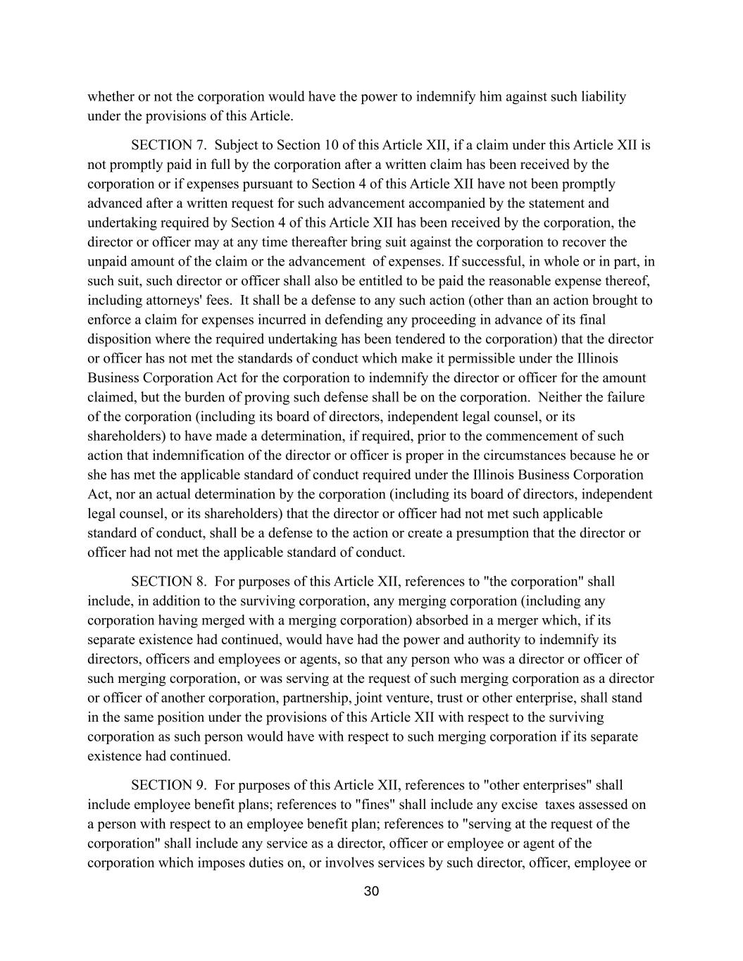 30 whether or not the corporation would have the power to indemnify him against such liability under the provisions of this Article. SECTION 7. Subject to Section 10 of this Article XII, if a claim under this Article XII is not promptly paid in full by the corporation after a written claim has been received by the corporation or if expenses pursuant to Section 4 of this Article XII have not been promptly advanced after a written request for such advancement accompanied by the statement and undertaking required by Section 4 of this Article XII has been received by the corporation, the director or officer may at any time thereafter bring suit against the corporation to recover the unpaid amount of the claim or the advancement of expenses. If successful, in whole or in part, in such suit, such director or officer shall also be entitled to be paid the reasonable expense thereof, including attorneys' fees. It shall be a defense to any such action (other than an action brought to enforce a claim for expenses incurred in defending any proceeding in advance of its final disposition where the required undertaking has been tendered to the corporation) that the director or officer has not met the standards of conduct which make it permissible under the Illinois Business Corporation Act for the corporation to indemnify the director or officer for the amount claimed, but the burden of proving such defense shall be on the corporation. Neither the failure of the corporation (including its board of directors, independent legal counsel, or its shareholders) to have made a determination, if required, prior to the commencement of such action that indemnification of the director or officer is proper in the circumstances because he or she has met the applicable standard of conduct required under the Illinois Business Corporation Act, nor an actual determination by the corporation (including its board of directors, independent legal counsel, or its shareholders) that the director or officer had not met such applicable standard of conduct, shall be a defense to the action or create a presumption that the director or officer had not met the applicable standard of conduct. SECTION 8. For purposes of this Article XII, references to "the corporation" shall include, in addition to the surviving corporation, any merging corporation (including any corporation having merged with a merging corporation) absorbed in a merger which, if its separate existence had continued, would have had the power and authority to indemnify its directors, officers and employees or agents, so that any person who was a director or officer of such merging corporation, or was serving at the request of such merging corporation as a director or officer of another corporation, partnership, joint venture, trust or other enterprise, shall stand in the same position under the provisions of this Article XII with respect to the surviving corporation as such person would have with respect to such merging corporation if its separate existence had continued. SECTION 9. For purposes of this Article XII, references to "other enterprises" shall include employee benefit plans; references to "fines" shall include any excise taxes assessed on a person with respect to an employee benefit plan; references to "serving at the request of the corporation" shall include any service as a director, officer or employee or agent of the corporation which imposes duties on, or involves services by such director, officer, employee or