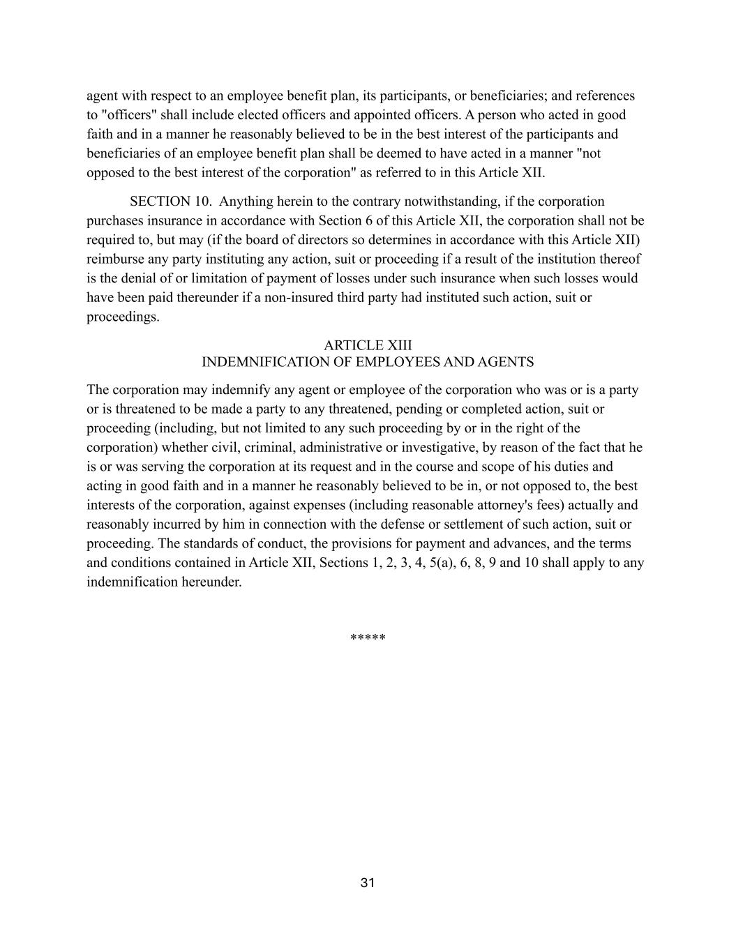 31 agent with respect to an employee benefit plan, its participants, or beneficiaries; and references to "officers" shall include elected officers and appointed officers. A person who acted in good faith and in a manner he reasonably believed to be in the best interest of the participants and beneficiaries of an employee benefit plan shall be deemed to have acted in a manner "not opposed to the best interest of the corporation" as referred to in this Article XII. SECTION 10. Anything herein to the contrary notwithstanding, if the corporation purchases insurance in accordance with Section 6 of this Article XII, the corporation shall not be required to, but may (if the board of directors so determines in accordance with this Article XII) reimburse any party instituting any action, suit or proceeding if a result of the institution thereof is the denial of or limitation of payment of losses under such insurance when such losses would have been paid thereunder if a non-insured third party had instituted such action, suit or proceedings. ARTICLE XIII INDEMNIFICATION OF EMPLOYEES AND AGENTS The corporation may indemnify any agent or employee of the corporation who was or is a party or is threatened to be made a party to any threatened, pending or completed action, suit or proceeding (including, but not limited to any such proceeding by or in the right of the corporation) whether civil, criminal, administrative or investigative, by reason of the fact that he is or was serving the corporation at its request and in the course and scope of his duties and acting in good faith and in a manner he reasonably believed to be in, or not opposed to, the best interests of the corporation, against expenses (including reasonable attorney's fees) actually and reasonably incurred by him in connection with the defense or settlement of such action, suit or proceeding. The standards of conduct, the provisions for payment and advances, and the terms and conditions contained in Article XII, Sections 1, 2, 3, 4, 5(a), 6, 8, 9 and 10 shall apply to any indemnification hereunder. *****