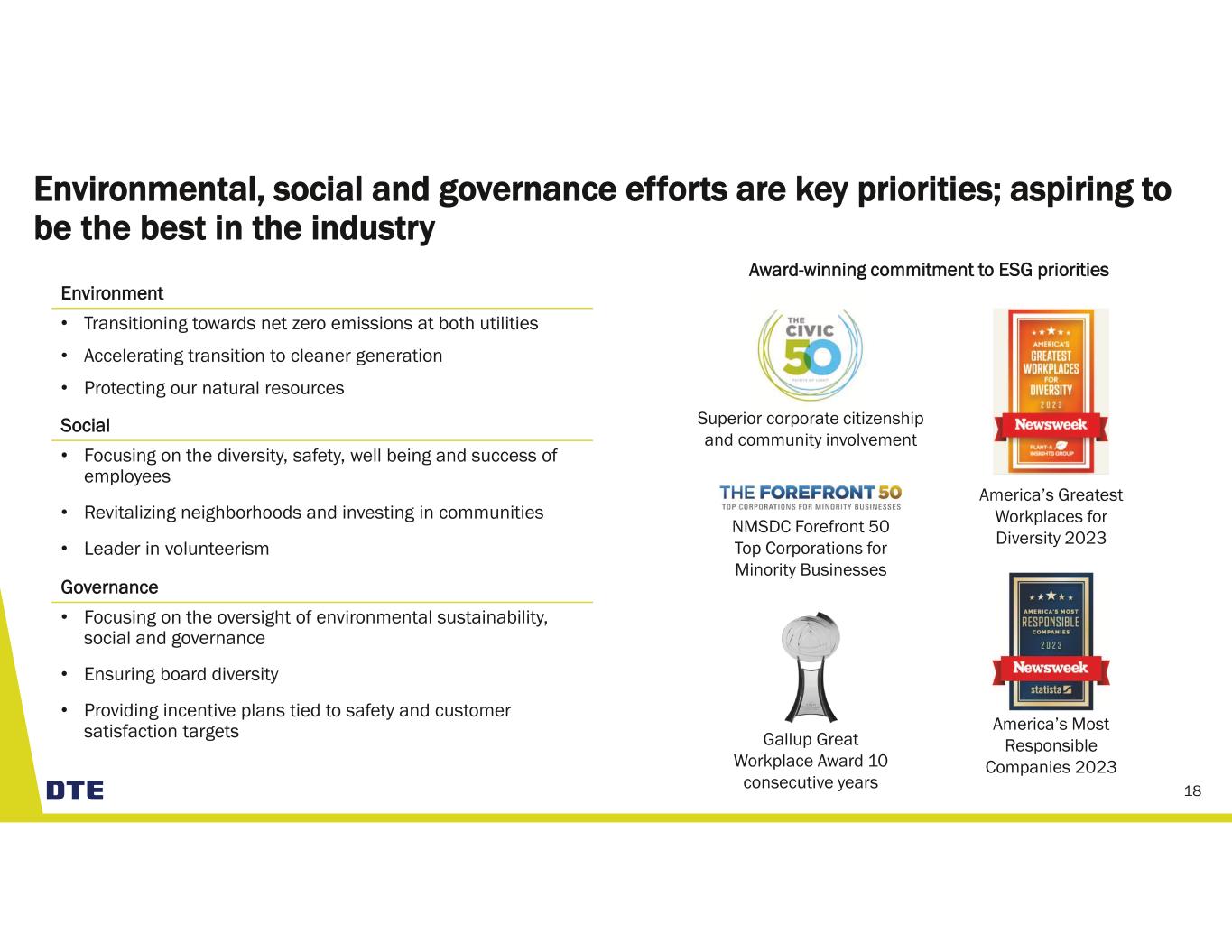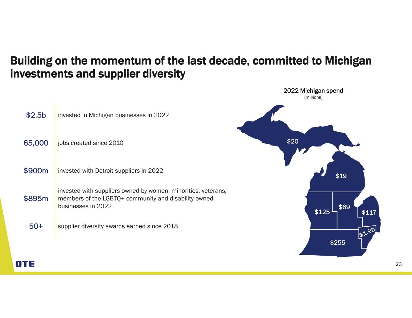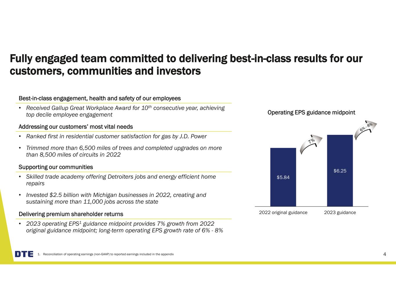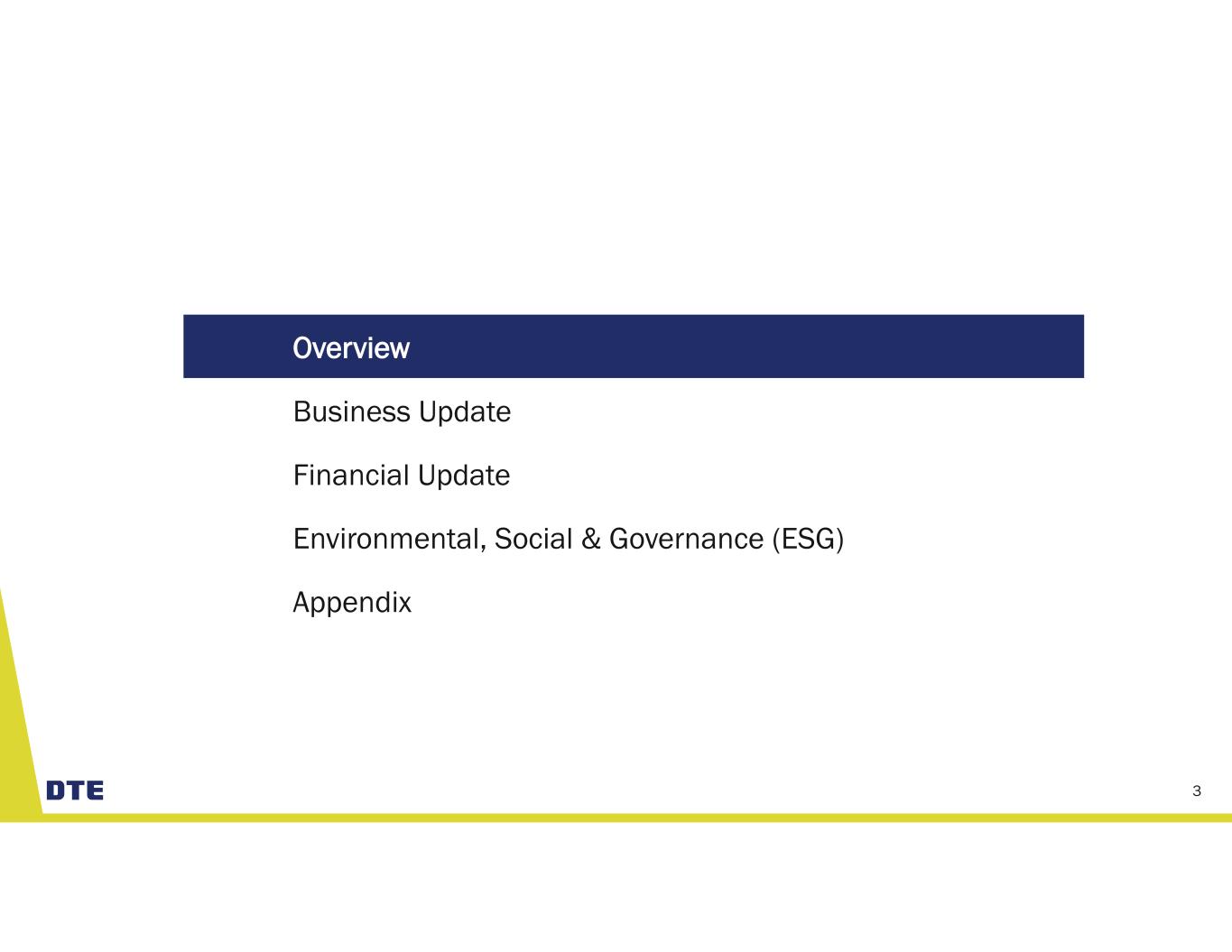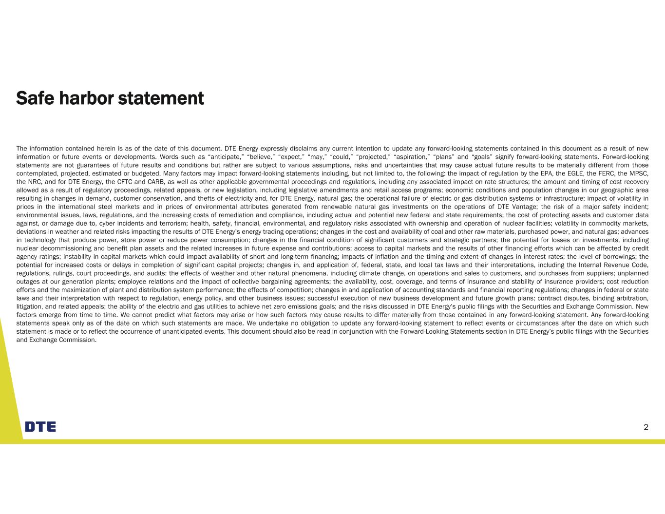Safe harbor statement 2 The information contained herein is as of the date of this document. DTE Energy expressly disclaims any current intention to update any forward-looking statements contained in this document as a result of new information or future events or developments. Words such as “anticipate,” “believe,” “expect,” “may,” “could,” “projected,” “aspiration,” “plans” and “goals” signify forward-looking statements. Forward-looking statements are not guarantees of future results and conditions but rather are subject to various assumptions, risks and uncertainties that may cause actual future results to be materially different from those contemplated, projected, estimated or budgeted. Many factors may impact forward-looking statements including, but not limited to, the following: the impact of regulation by the EPA, the EGLE, the FERC, the MPSC, the NRC, and for DTE Energy, the CFTC and CARB, as well as other applicable governmental proceedings and regulations, including any associated impact on rate structures; the amount and timing of cost recovery allowed as a result of regulatory proceedings, related appeals, or new legislation, including legislative amendments and retail access programs; economic conditions and population changes in our geographic area resulting in changes in demand, customer conservation, and thefts of electricity and, for DTE Energy, natural gas; the operational failure of electric or gas distribution systems or infrastructure; impact of volatility in prices in the international steel markets and in prices of environmental attributes generated from renewable natural gas investments on the operations of DTE Vantage; the risk of a major safety incident; environmental issues, laws, regulations, and the increasing costs of remediation and compliance, including actual and potential new federal and state requirements; the cost of protecting assets and customer data against, or damage due to, cyber incidents and terrorism; health, safety, financial, environmental, and regulatory risks associated with ownership and operation of nuclear facilities; volatility in commodity markets, deviations in weather and related risks impacting the results of DTE Energy’s energy trading operations; changes in the cost and availability of coal and other raw materials, purchased power, and natural gas; advances in technology that produce power, store power or reduce power consumption; changes in the financial condition of significant customers and strategic partners; the potential for losses on investments, including nuclear decommissioning and benefit plan assets and the related increases in future expense and contributions; access to capital markets and the results of other financing efforts which can be affected by credit agency ratings; instability in capital markets which could impact availability of short and long-term financing; impacts of inflation and the timing and extent of changes in interest rates; the level of borrowings; the potential for increased costs or delays in completion of significant capital projects; changes in, and application of, federal, state, and local tax laws and their interpretations, including the Internal Revenue Code, regulations, rulings, court proceedings, and audits; the effects of weather and other natural phenomena, including climate change, on operations and sales to customers, and purchases from suppliers; unplanned outages at our generation plants; employee relations and the impact of collective bargaining agreements; the availability, cost, coverage, and terms of insurance and stability of insurance providers; cost reduction efforts and the maximization of plant and distribution system performance; the effects of competition; changes in and application of accounting standards and financial reporting regulations; changes in federal or state laws and their interpretation with respect to regulation, energy policy, and other business issues; successful execution of new business development and future growth plans; contract disputes, binding arbitration, litigation, and related appeals; the ability of the electric and gas utilities to achieve net zero emissions goals; and the risks discussed in DTE Energy’s public filings with the Securities and Exchange Commission. New factors emerge from time to time. We cannot predict what factors may arise or how such factors may cause results to differ materially from those contained in any forward-looking statement. Any forward-looking statements speak only as of the date on which such statements are made. We undertake no obligation to update any forward-looking statement to reflect events or circumstances after the date on which such statement is made or to reflect the occurrence of unanticipated events. This document should also be read in conjunction with the Forward-Looking Statements section in DTE Energy’s public filings with the Securities and Exchange Commission.