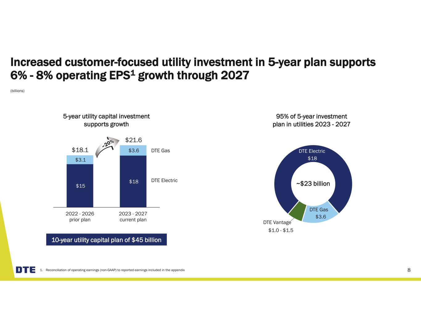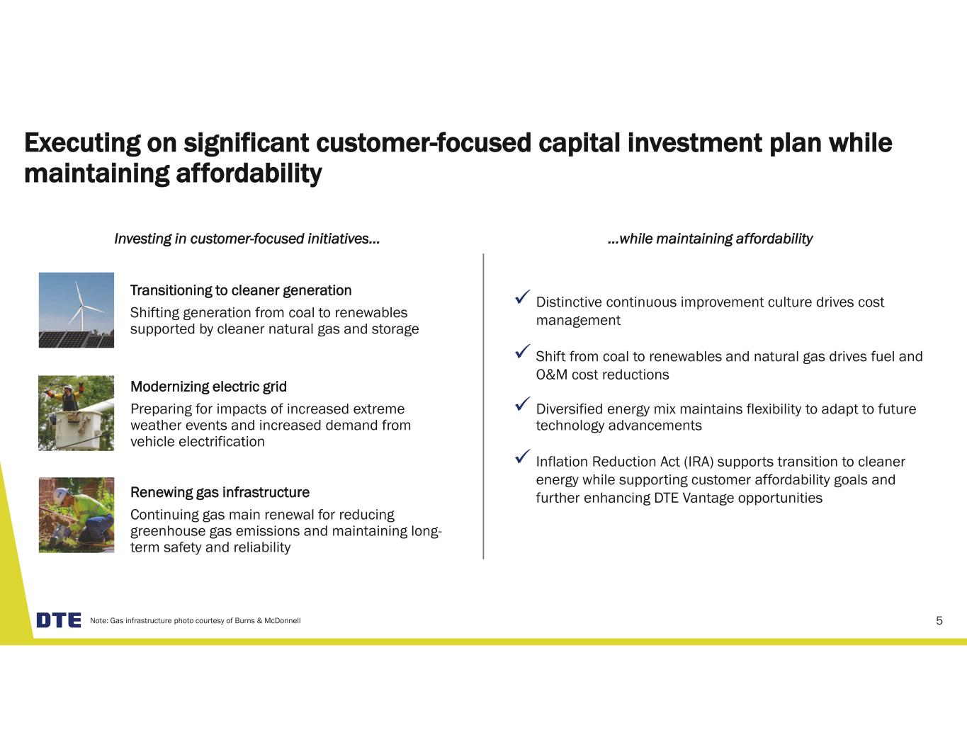 Fully engaged team committed to delivering best-in-class results for our customers, communities and investors 1. Reconciliation of operating earnings (non-GAAP) to reported earnings included in the appendix 4 Best-in-class engagement, health and safety of our employees • Received Gallup Great Workplace Award for 10th consecutive year, achieving top decile employee engagement Addressing our customers’ most vital needs • Ranked first in residential customer satisfaction for gas by J.D. Power • Trimmed more than 6,500 miles of trees and completed upgrades on more than 8,500 miles of circuits in 2022 Supporting our communities • Skilled trade academy offering Detroiters jobs and energy efficient home repairs • Invested $2.5 billion with Michigan businesses in 2022, creating and sustaining more than 11,000 jobs across the state Delivering premium shareholder returns • 2023 operating EPS1 guidance midpoint provides 7% growth from 2022 original guidance midpoint; long-term operating EPS growth rate of 6% - 8% Operating EPS guidance midpoint $5.84 $6.25 2022 original guidance 2023 guidance