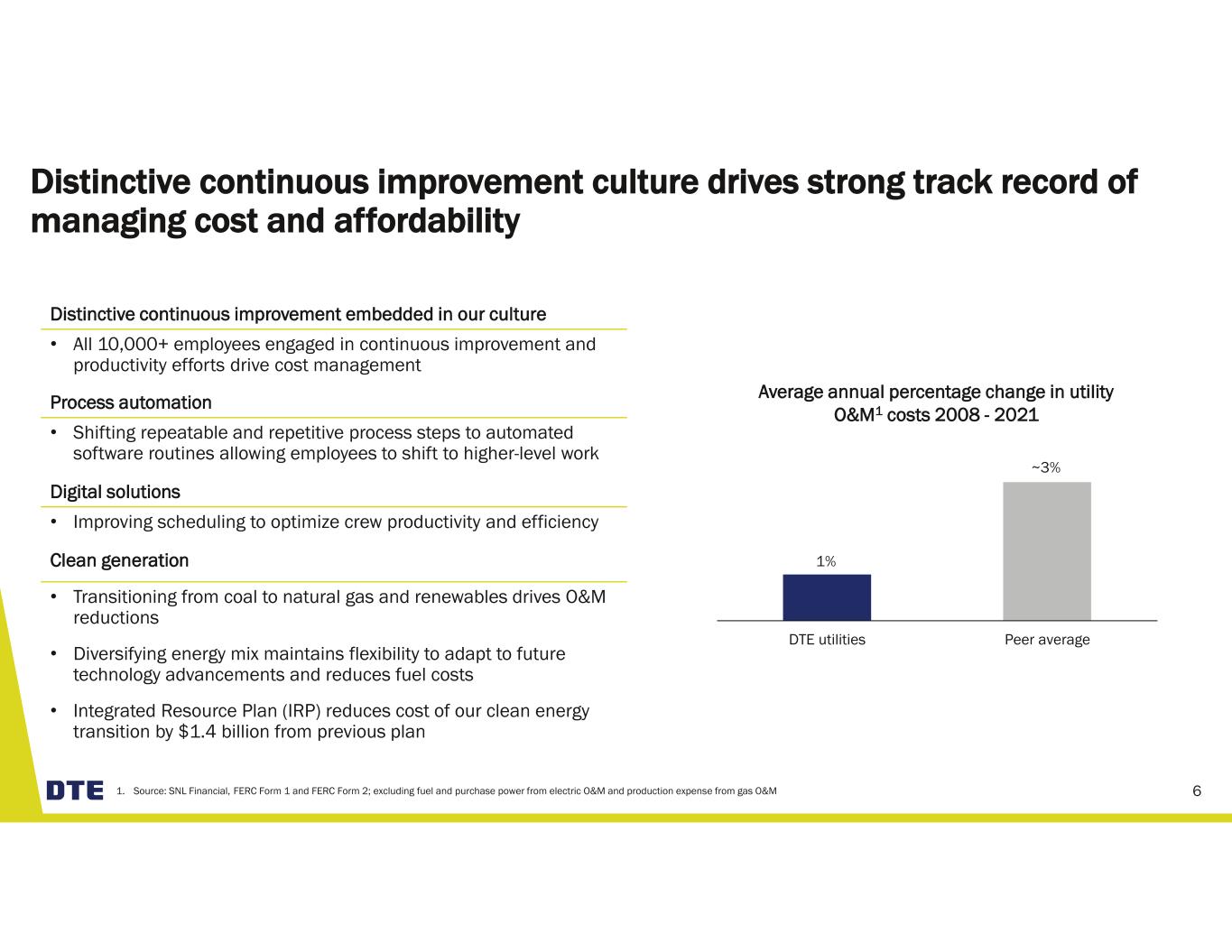 Executing on significant customer-focused capital investment plan while maintaining affordability Note: Gas infrastructure photo courtesy of Burns & McDonnell 5 Investing in customer-focused initiatives… …while maintaining affordability Distinctive continuous improvement culture drives cost management Shift from coal to renewables and natural gas drives fuel and O&M cost reductions Diversified energy mix maintains flexibility to adapt to future technology advancements Inflation Reduction Act (IRA) supports transition to cleaner energy while supporting customer affordability goals and further enhancing DTE Vantage opportunities Modernizing electric grid Preparing for impacts of increased extreme weather events and increased demand from vehicle electrification Renewing gas infrastructure Continuing gas main renewal for reducing greenhouse gas emissions and maintaining long- term safety and reliability Transitioning to cleaner generation Shifting generation from coal to renewables supported by cleaner natural gas and storage