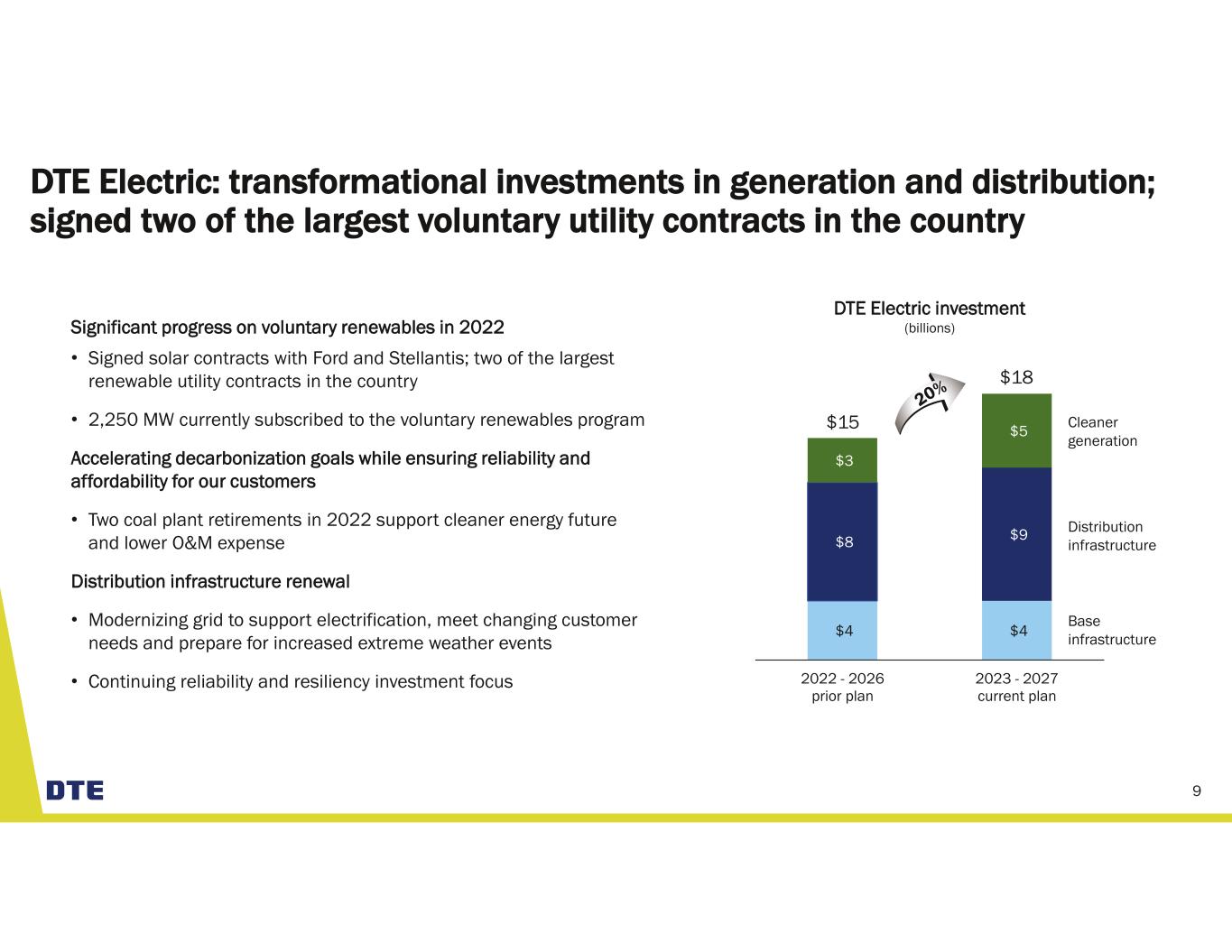 $15 $18 $3.1 $3.6 2022 - 2026 prior plan 2023 - 2027 current plan $18.1 Increased customer-focused utility investment in 5-year plan supports 6% - 8% operating EPS1 growth through 2027 8 DTE Gas DTE Electric ~$23 billion DTE Electric DTE Gas DTE Vantage $18 $3.6 $1.0 - $1.5 95% of 5-year investment plan in utilities 2023 - 2027 $21.6 (billions) 5-year utility capital investment supports growth 1. Reconciliation of operating earnings (non-GAAP) to reported earnings included in the appendix 10-year utility capital plan of $45 billion