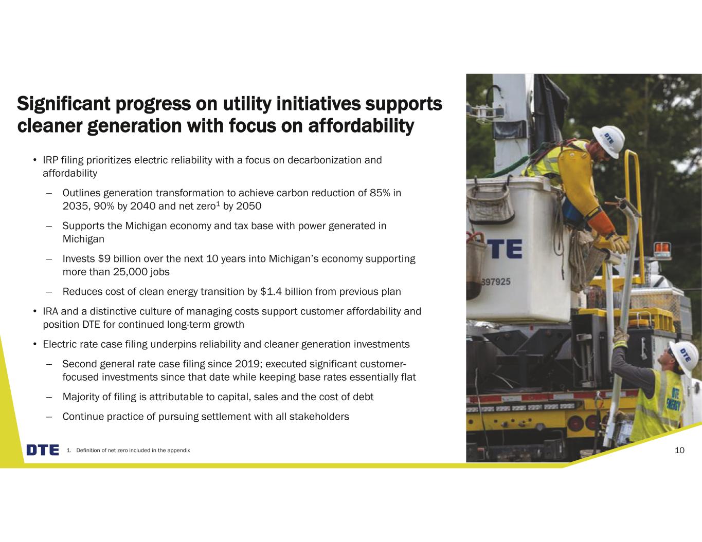 $4 $4 $8 $9 $3 $5 2022 - 2026 prior plan 2023 - 2027 current plan DTE Electric: transformational investments in generation and distribution; signed two of the largest voluntary utility contracts in the country 9 Significant progress on voluntary renewables in 2022 • Signed solar contracts with Ford and Stellantis; two of the largest renewable utility contracts in the country • 2,250 MW currently subscribed to the voluntary renewables program Accelerating decarbonization goals while ensuring reliability and affordability for our customers • Two coal plant retirements in 2022 support cleaner energy future and lower O&M expense Distribution infrastructure renewal • Modernizing grid to support electrification, meet changing customer needs and prepare for increased extreme weather events • Continuing reliability and resiliency investment focus Distribution infrastructure Base infrastructure Cleaner generation $15 $18 DTE Electric investment (billions)
