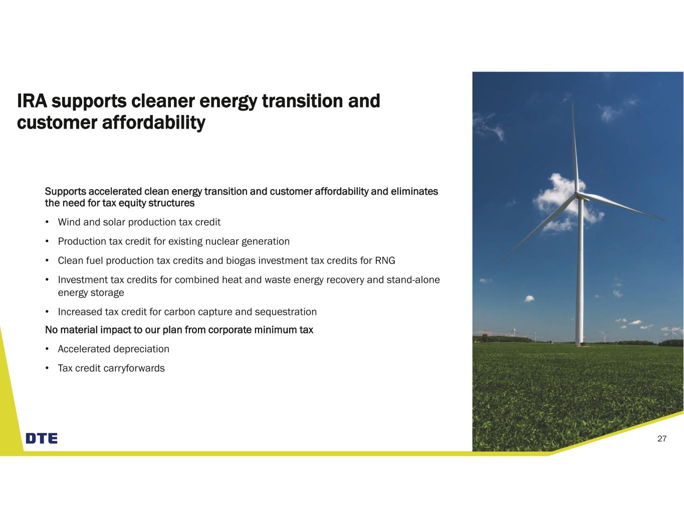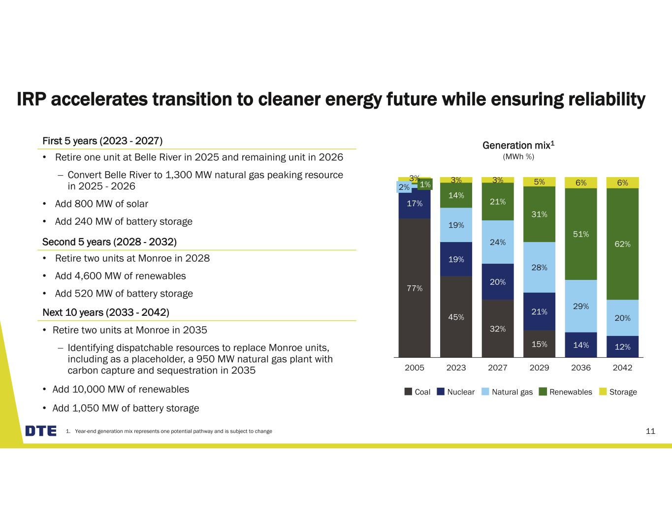 Significant progress on utility initiatives supports cleaner generation with focus on affordability 1. Definition of net zero included in the appendix 10 • IRP filing prioritizes electric reliability with a focus on decarbonization and affordability Outlines generation transformation to achieve carbon reduction of 85% in 2035, 90% by 2040 and net zero1 by 2050 Supports the Michigan economy and tax base with power generated in Michigan Invests $9 billion over the next 10 years into Michigan’s economy supporting more than 25,000 jobs Reduces cost of clean energy transition by $1.4 billion from previous plan • IRA and a distinctive culture of managing costs support customer affordability and position DTE for continued long-term growth • Electric rate case filing underpins reliability and cleaner generation investments Second general rate case filing since 2019; executed significant customer- focused investments since that date while keeping base rates essentially flat Majority of filing is attributable to capital, sales and the cost of debt Continue practice of pursuing settlement with all stakeholders