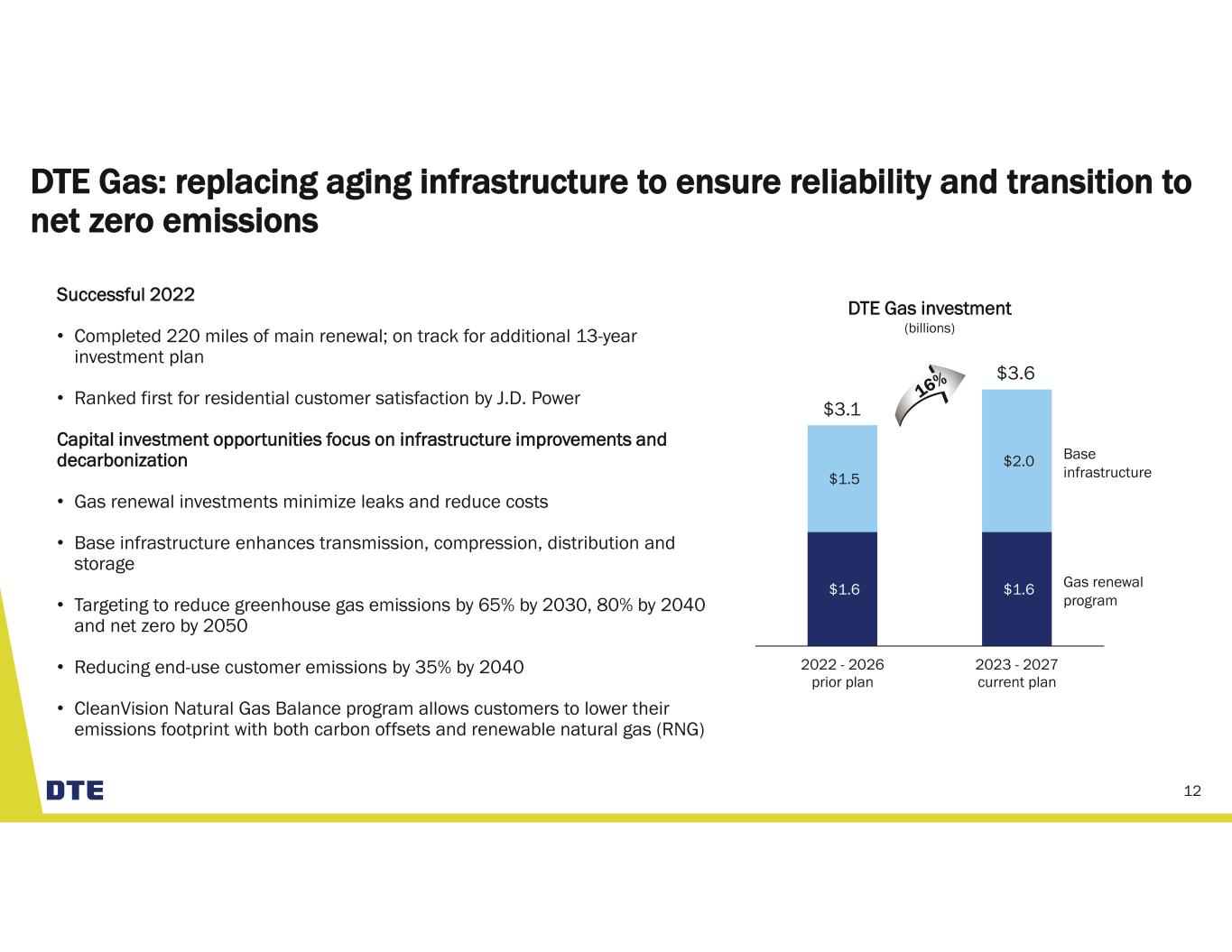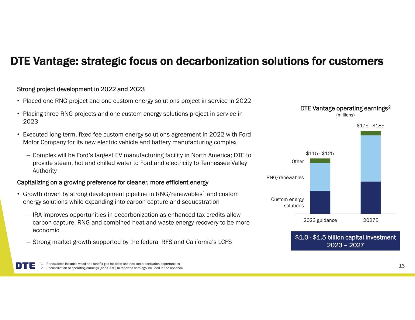 $1.6 $1.6 $1.5 $2.0 2022 - 2026 prior plan 2023 - 2027 current plan DTE Gas investment (billions) DTE Gas: replacing aging infrastructure to ensure reliability and transition to net zero emissions 12 Gas renewal program Base infrastructure Successful 2022 • Completed 220 miles of main renewal; on track for additional 13-year investment plan • Ranked first for residential customer satisfaction by J.D. Power Capital investment opportunities focus on infrastructure improvements and decarbonization • Gas renewal investments minimize leaks and reduce costs • Base infrastructure enhances transmission, compression, distribution and storage • Targeting to reduce greenhouse gas emissions by 65% by 2030, 80% by 2040 and net zero by 2050 • Reducing end-use customer emissions by 35% by 2040 • CleanVision Natural Gas Balance program allows customers to lower their emissions footprint with both carbon offsets and renewable natural gas (RNG) $3.1 $3.6