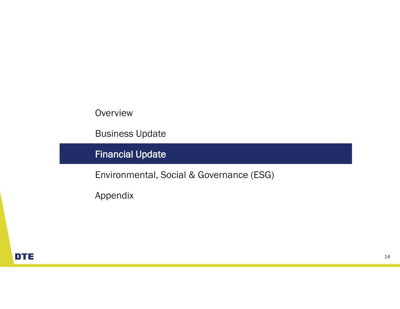 DTE Vantage: strategic focus on decarbonization solutions for customers 1. Renewables includes wood and landfill gas facilities and new decarbonization opportunities 2. Reconciliation of operating earnings (non-GAAP) to reported earnings included in the appendix 13 Strong project development in 2022 and 2023 • Placed one RNG project and one custom energy solutions project in service in 2022 • Placing three RNG projects and one custom energy solutions project in service in 2023 • Executed long-term, fixed-fee custom energy solutions agreement in 2022 with Ford Motor Company for its new electric vehicle and battery manufacturing complex Complex will be Ford’s largest EV manufacturing facility in North America; DTE to provide steam, hot and chilled water to Ford and electricity to Tennessee Valley Authority Capitalizing on a growing preference for cleaner, more efficient energy • Growth driven by strong development pipeline in RNG/renewables1 and custom energy solutions while expanding into carbon capture and sequestration IRA improves opportunities in decarbonization as enhanced tax credits allow carbon capture, RNG and combined heat and waste energy recovery to be more economic Strong market growth supported by the federal RFS and California’s LCFS 2023 guidance 2027E Custom energy solutions Other RNG/renewables $115 - $125 $175 - $185 DTE Vantage operating earnings2 (millions) $1.0 - $1.5 billion capital investment 2023 – 2027