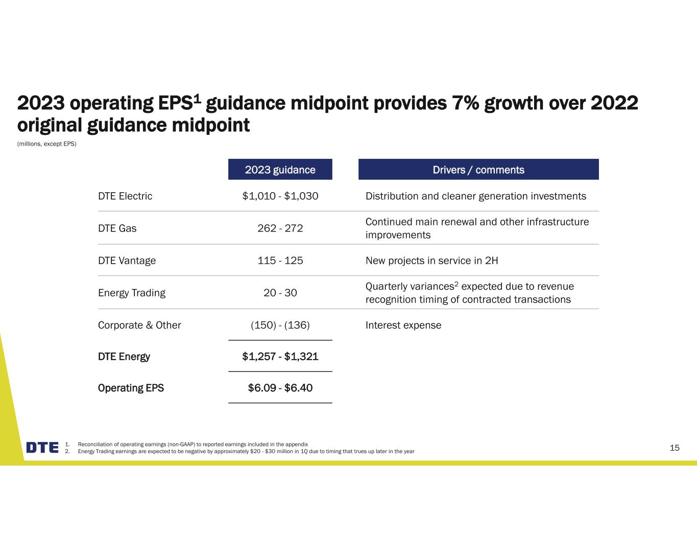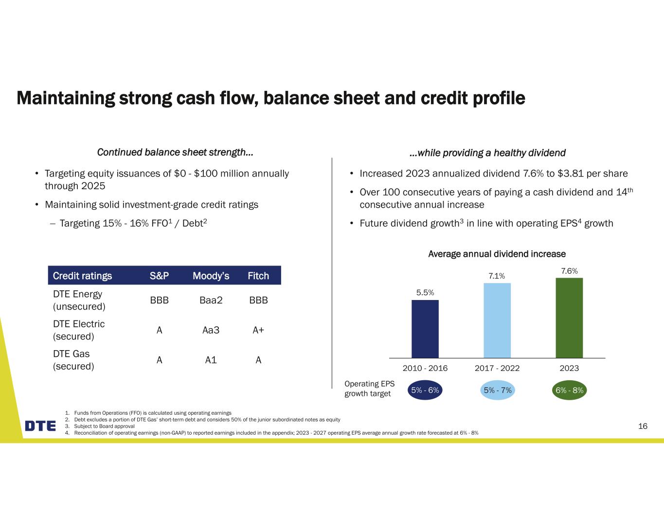 2023 operating EPS1 guidance midpoint provides 7% growth over 2022 original guidance midpoint 1. Reconciliation of operating earnings (non-GAAP) to reported earnings included in the appendix 2. Energy Trading earnings are expected to be negative by approximately $20 - $30 million in 1Q due to timing that trues up later in the year 15 (millions, except EPS) 2023 guidance Drivers / comments DTE Electric $1,010 - $1,030 Distribution and cleaner generation investments DTE Gas 262 - 272 Continued main renewal and other infrastructure improvements DTE Vantage 115 - 125 New projects in service in 2H Energy Trading 20 - 30 Quarterly variances2 expected due to revenue recognition timing of contracted transactions Corporate & Other (150) - (136) Interest expense DTE Energy $1,257 - $1,321 Operating EPS $6.09 - $6.40