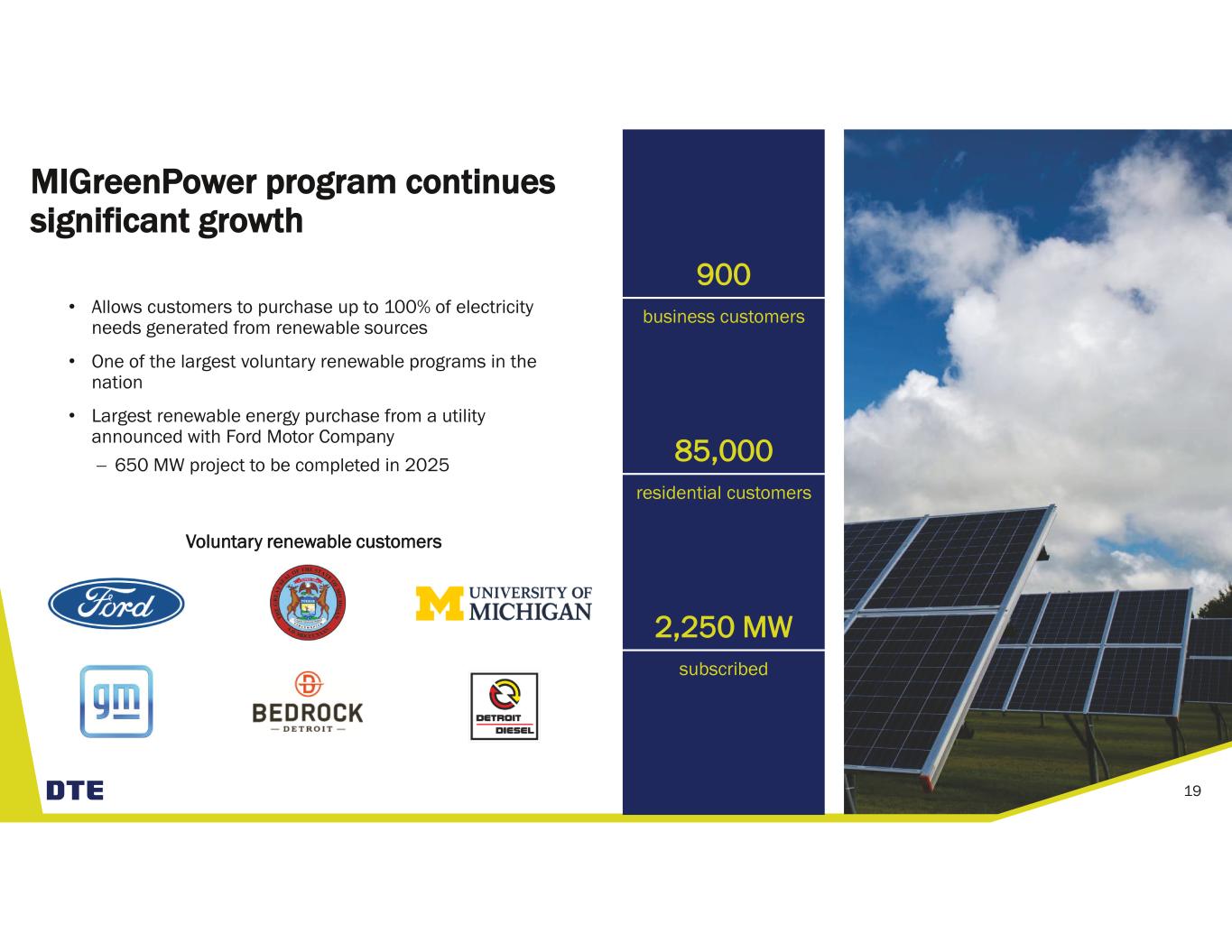 MIGreenPower program continues significant growth 19 900 business customers 85,000 residential customers 2,250 MW subscribed • Allows customers to purchase up to 100% of electricity needs generated from renewable sources • One of the largest voluntary renewable programs in the nation • Largest renewable energy purchase from a utility announced with Ford Motor Company 650 MW project to be completed in 2025 Voluntary renewable customers